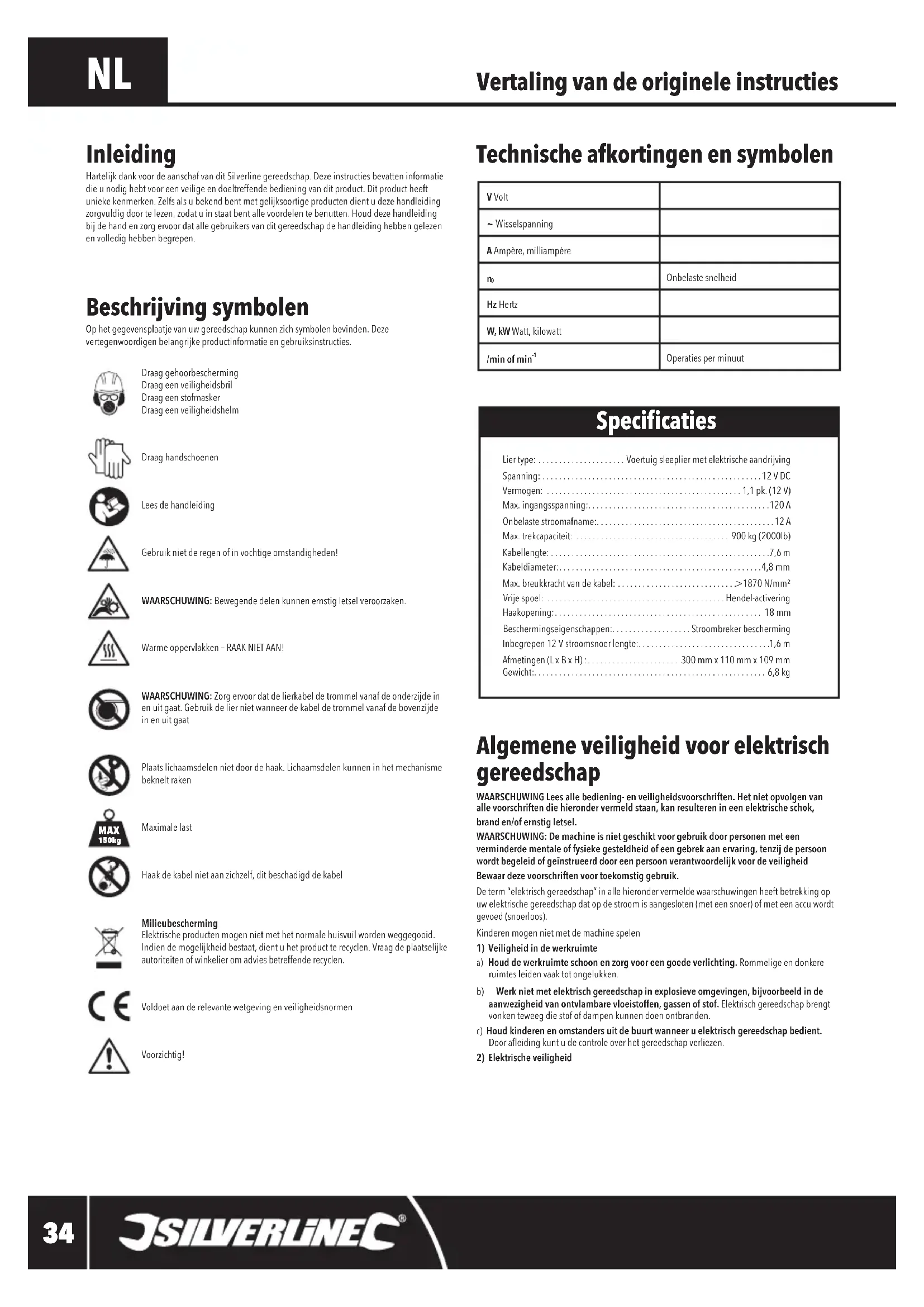Algemene veiligheid voor elektrisch gereedschap WAARSCHUWING Lees alle bediening- en veiligheidsvoorschriften. Het niet opvolgen van alle voorschriften die hieronder vermeld staan, kan resulteren in een elektrische schok, brand en/of ernstig letsel.WAARSCHUWING: De machine is niet geschikt voor gebruik door personen met een verminderde mentale of fysieke gesteldheid of een gebrek aan ervaring, tenzij de persoon wordt begeleid of geïnstrueerd door een persoon verantwoordelijk voor de veiligheidBewaar deze voorschriften voor toekomstig gebruik. Determ“elektrischgereedschap”inallehierondervermeldewaarschuwingenheeftbetrekkingopuwelektrischegereedschapdatopdestroomisaangesloten(meteensnoer)ofmeteenaccuwordtgevoed(snoerloos).Kinderenmogennietmetdemachinespelen1) Veiligheid in de werkruimte a) Houd de werkruimte schoon en zorg voor een goede verlichting. Rommeligeendonkere ruimtesleidenvaaktotongelukken.b) Werk niet met elektrisch gereedschap in explosieve omgevingen, bijvoorbeeld in de aanwezigheid van ontvlambare vloeistoffen, gassen of stof. Elektrischgereedschapbrengtvonkenteweegdiestofofdampenkunnendoenontbranden.c) Houd kinderen en omstanders uit de buurt wanneer u elektrisch gereedschap bedient. Dooraeidingkuntudecontroleoverhetgereedschapverliezen.2) Elektrische veiligheid Vertaling van de originele instructies Technische afkortingen en symbolen Beschrijving symbolen Ophetgegevensplaatjevanuwgereedschapkunnenzichsymbolenbevinden.Dezevertegenwoordigenbelangrijkeproductinformatieengebruiksinstructies.DraaggehoorbeschermingDraageenveiligheidsbrilDraageenstofmaskerDraageenveiligheidshelmDraaghandschoenenLeesdehandleidingGebruiknietderegenofinvochtigeomstandigheden!WAARSCHUWING: Bewegendedelenkunnenernstigletselveroorzaken.Warmeoppervlakken–RAAKNIETAAN!WAARSCHUWING: Zorgervoordatdelierkabeldetrommelvanafdeonderzijdeinenuitgaat.GebruikdeliernietwanneerdekabeldetrommelvanafdebovenzijdeinenuitgaatPlaats lichaamsdelen niet door de haak. Lichaamsdelen kunnen in het mechanisme bekneltrakenMaximale lastHaakdekabelnietaanzichzelf,ditbeschadigddekabelMilieubescherming Elektrischeproductenmogennietmethetnormalehuisvuilwordenweggegooid.Indiendemogelijkheidbestaat,dientuhetproductterecyclen.Vraagdeplaatselijkeautoriteitenofwinkelieromadviesbetreffenderecyclen.VoldoetaanderelevantewetgevingenveiligheidsnormenVoorzichtig!