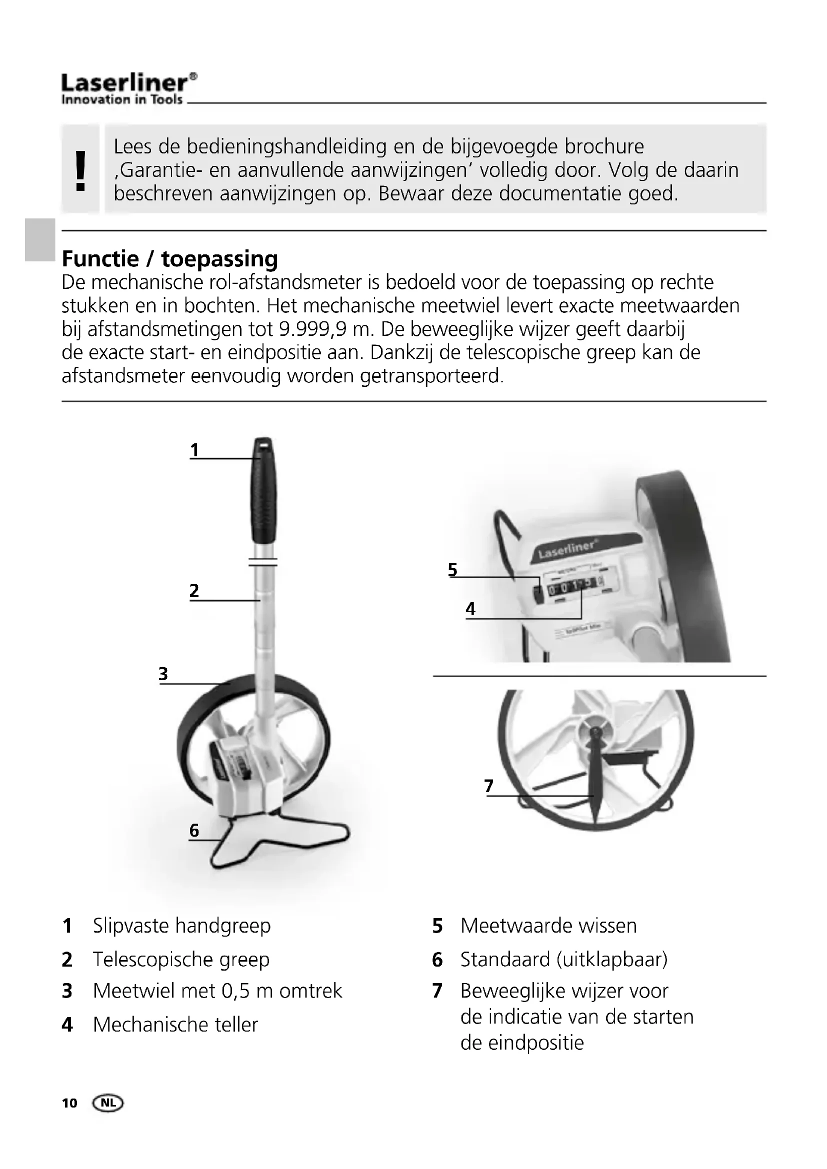 Functie / toepassing De mechanische rol-afstandsmeter is bedoeld voor de toepassing op rechte stukken en in bochten. Het mechanische meetwiel levert exacte meetwaarden bij afstandsmetingen tot 9.999,9 m. De beweeglijke wijzer geeft daarbij de exacte start- en eindpositie aan. Dankzij de telescopische greep kan de afstandsmeter eenvoudig worden getransporteerd. Slipvaste handgreep Telescopische greep Meetwiel met 0,5 m omtrek Mechanische teller Meetwaarde wissen Standaard (uitklapbaar) Beweeglijke wijzer voor de indicatie van de starten de eindpositie