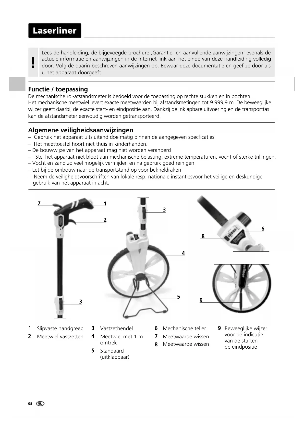 Functie / toepassing De mechanische rol-afstandsmeter is bedoeld voor de toepassing op rechte stukken en in bochten. Het mechanische meetwiel levert exacte meetwaarden bij afstandsmetingen tot 9.999,9 m. De beweeglijke wijzer geeft daarbij de exacte start- en eindpositie aan. Dankzij de inklapbare uitvoering en de transporttas kan de afstandsmeter eenvoudig worden getransporteerd. Algemene veiligheidsaanwijzingen – Gebruik het apparaat uitsluitend doelmatig binnen de aangegeven speccaties. – Het meettoestel hoort niet thuis in kinderhanden. – De bouwwijze van het apparaat mag niet worden veranderd! – Stel het apparaat niet bloot aan mechanische belasting, extreme temperaturen, vocht of sterke trillingen. – Vocht en zand zo veel mogelijk vermijden en na gebruik goed reinigen – Let bij de ombouw naar de transportstand op voor bekneldraken – Neem de veiligheidsvoorschriften van lokale resp. nationale instantiesvoor het veilige en deskundige gebruik van het apparaat in acht.