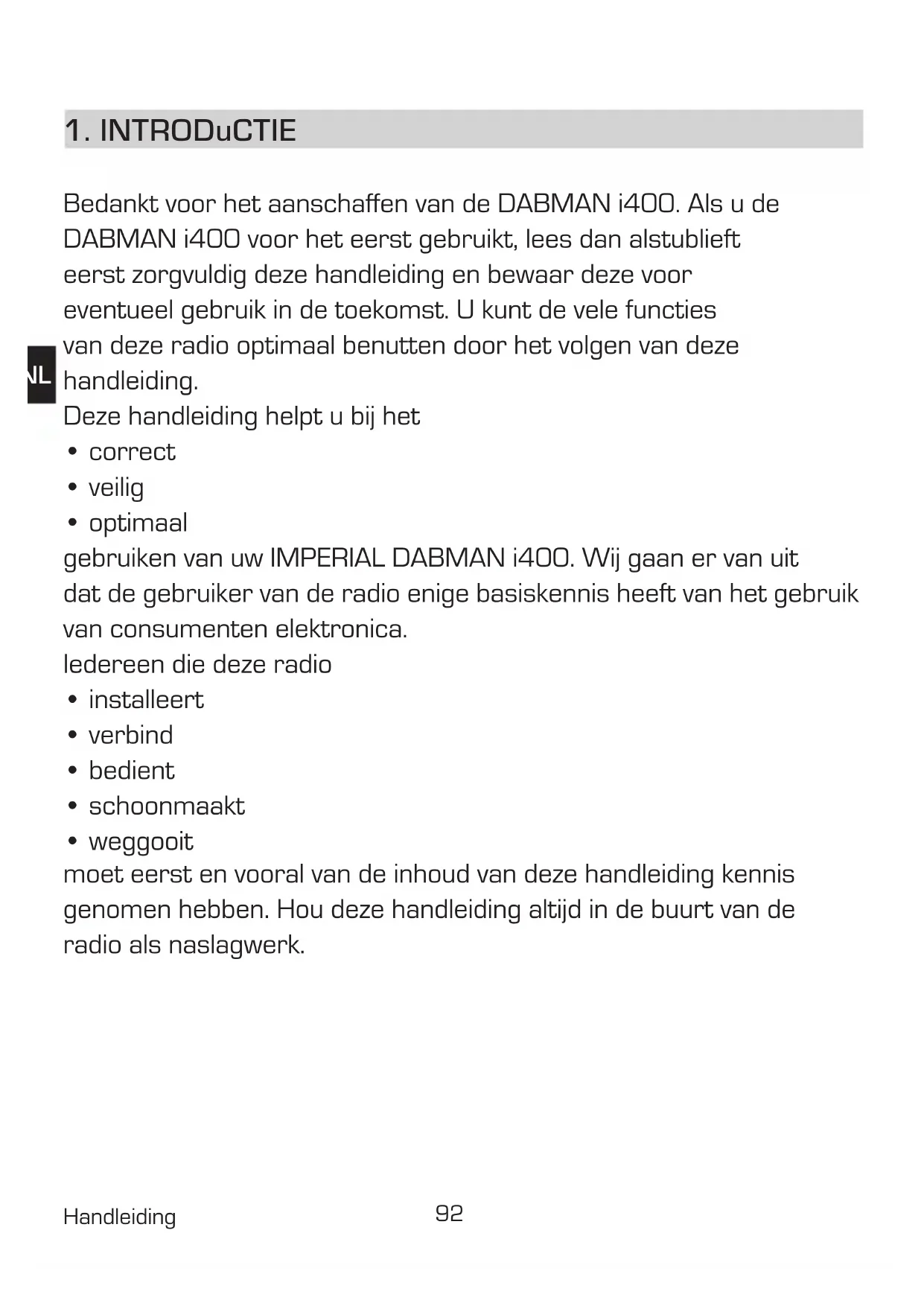 Bedankt voor het aanschaen van de DABMAN i400. Als u de DABMAN i400 voor het eerst gebruikt, lees dan alstublieft eerst zorgvuldig deze handleiding en bewaar deze voor eventueel gebruik in de toekomst. U kunt de vele functies van deze radio optimaal benutten door het volgen van deze handleiding. Deze handleiding helpt u bij het