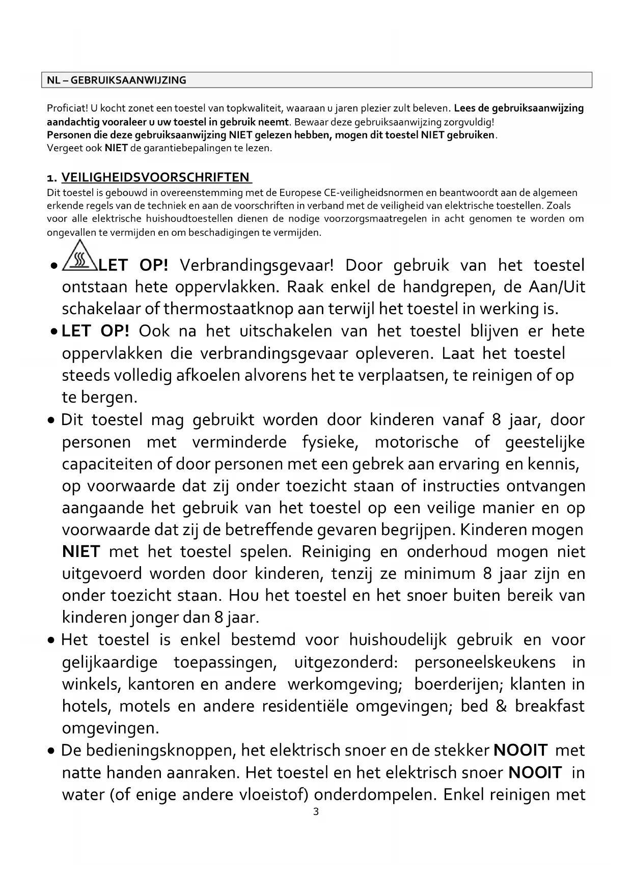 - LET OP! Verbrandingsgevaar! Door gebruik van het toestel ontstaan hete oppervlakken. Raak enkel de handgrepen, de Aan/Uit schakelaar of thermostaatknop aan terwijl het toestel in werking is.