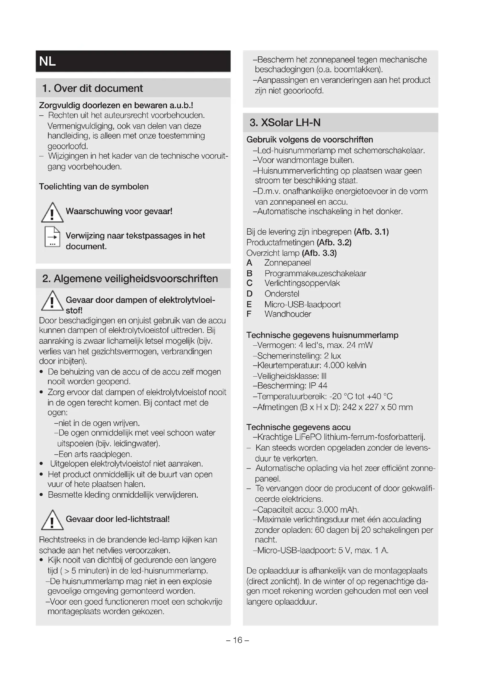 - Kijk nooit van dichtbij of gedurende een langere tijd ( > 5 minuten) in de led-huisnummerlamp. – De huisnummerlamp mag niet in een explosie gevoelige omgeving gemonteerd worden. – Voor een goed functioneren moet een schokvrije montageplaats worden gekozen. – Bescherm het zonnepaneel tegen mechanische beschadegingen (o.a. boomtakken). – Aanpassingen en veranderingen aan het product zijn niet geoorloofd. 3 XSolar LH-N Gebruik volgens de voorschriften – Led-huisnummerlamp met schemerschakelaar. – Voor wandmontage buiten. – Huisnummerverlichting op plaatsen waar geen stroom ter beschikking staat. – D.m.v. onafhankelijke energietoevoer in de vorm van zonnepaneel en accu. – Automatische inschakeling in het donker. Bij de levering zijn inbegrepen (Afb 31) Productafmetingen (Afb 32) Overzicht lamp (Afb 33) A Zonnepaneel B Programmakeuzeschakelaar C Verlichtingsoppervlak D Onderstel E Micro-USB-laadpoort F Wandhouder Technische gegevens huisnummerlamp – Vermogen: 4 led's, max. 24 mW – Schemerinstelling: 2 lux – Kleurtemperatuur: 4.000 kelvin – Veiligheidsklasse: III – Bescherming: IP 44 – Temperatuurbereik: -20 °C tot +40 °C – Afmetingen (BxHxD): 242 x 227 x 50 mm Technische gegevens accu – Krachtige LiFePO lithium-ferrum-fosforbatterij. – Kan steeds worden opgeladen zonder de levens- duur te verkorten. – Automatische oplading via het zeer eciënt zonne- paneel. – Te vervangen door de producent of door gekwalifi- ceerde elektriciens. – Capaciteit accu: 3.000mAh. – Maximale verlichtingsduur met één acculading zonder opladen: 60 dagen bij 20 schakelingen per nacht. – Micro-USB-laadpoort: 5 V, max. 1 A. De oplaadduur is afhankelijk van de montageplaats (direct zonlicht). In de winter of op regenachtige da- gen moet rekening worden gehouden met een veel langere oplaadduur.– 17 – 4 Montage