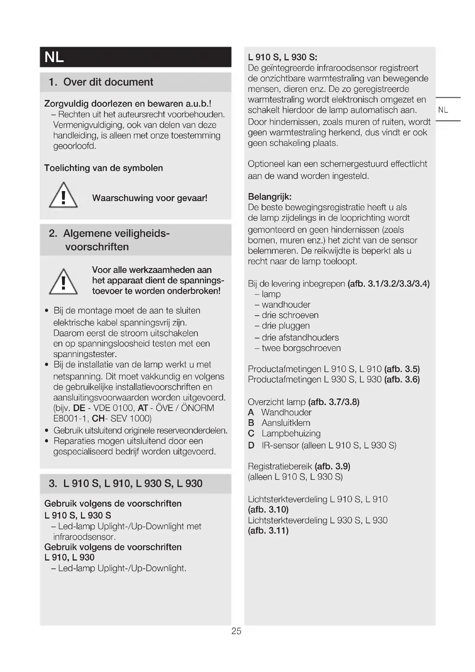 - Reparaties mogen uitsluitend door een gespecialiseerd bedrijf worden uitgevoerd. 3 L910S, L910, L930S, L930 Gebruik volgens de voorschriften L910S, L930S – Led-lamp Uplight-/Up-Downlight met infraroodsensor. Gebruik volgens de voorschriften L910, L930 – Led-lamp Uplight-/Up-Downlight. L910S, L930S: De geïntegreerde infraroodsensor registreert de onzichtbare warmtestraling van bewegende mensen, dieren enz. De zo geregistreerde warmtestraling wordt elektronisch omgezet en schakelt hierdoor de lamp automatisch aan. Door hindernissen, zoals muren of ruiten, wordt geen warmtestraling herkend, dus vindt er ook geen schakeling plaats. Optioneel kan een schemergestuurd eectlicht aan de wand worden ingesteld. Belangrijk: De beste bewegingsregistratie heeft u als de lamp zijdelings in de looprichting wordt gemonteerd en geen hindernissen (zoals bomen, muren enz.) het zicht van de sensor belemmeren. De reikwijdte is beperkt als u recht naar de lamp toeloopt. Bij de levering inbegrepen (afb 31/32/33/34) – lamp – wandhouder – drie schroeven – drie pluggen – drie afstandhouders – twee borgschroeven Productafmetingen L910S, L910 (afb 35) Productafmetingen L930S, L930 (afb 36) Overzicht lamp (afb 37/38) A Wandhouder B Aansluitklem C Lampbehuizing D IR-sensor (alleen L910S, L930S) Registratiebereik (afb 39) (alleen L910S, L930S) Lichtsterkteverdeling L910S, L910 (afb 310) Lichtsterkteverdeling L930S, L930 (afb 311) NL26 4 Elektrische aansluiting Schakelschema (afb 41) De stroomtoevoer bestaat uit een 3-polige kabel: L = fase (meestal zwart, bruin of grijs) N = nuldraad (meestal blauw) PE = aarde (groen/geel) K = communicatiekabel (optioneel) (alleen L910S, L930S) In geval van twijfel moeten de leidingen met een spanningstester worden geïdentificeerd; vervolgens weer spanningsvrij maken. De fase (L) en de nuldraad (N) worden op de aansluitklem aangesloten, de aarde (PE) op de klem (E) (afb 55/56). Belangrijk: Het verwisselen van de aansluitingen leidt in het apparaat of in uw meterkast later tot kortsluiting. In dit geval moeten de afzonderlijke leidingen nogmaals geïdentificeerd en opnieuw verbonden worden. In de kabel kan natuurlijk een schakelaar voor in- en uitschakelen worden gemonteerd. De lichtbron van deze lamp kan niet worden vervangen. Mocht het noodzakelijk worden om die te vervangen (bijv. aan het einde van zijn levensduur), dan moet de complete lamp worden vervangen. Groepsgedrag Met communicatiekabel (K) is een STEINEL- interne groepskoppeling mogelijk van L910S, L930S. Verwijder hiervoor het afdeklipje in de aansluitkamer (afb 42). Er kunnen max. 10 lampen aan elkaar worden gekoppeld. De max. lengte van de communi- catiekabel mag 50 m zijn. De eerste lamp van een groep die een bewe- ging registreert, schakelt de complete groep AAN. Wanneer na afloop van de ingestelde tijd geen bewegingen meer worden waargenomen, schakelt de laatste lamp van een groep de complete groep UIT. Opmerking: – Er mag geen spanning worden gezet op de communicatiekabel. Er mogen geen externe belastingen worden geschakeld! – Binnen de gekoppelde groepen volgen alle lampen hun individueel m.b.v. de DIP- schakelaars ingestelde waarden. – In de testmodus is geen groepskoppeling mogelijk. 5 Montage