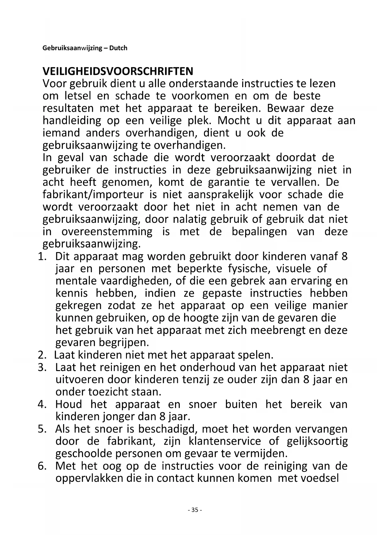 Återvinning - EU-direktiv 2012/19/EU Denna markering indikerar att produkten inte får kastas tillsammans med övrigt hushållsavfall. För att förhindra eventuell skada på miljön eller människors hälsa på grund av okontrollerad avfallshantering, återvinns de på ett ansvarsfullt sätt som främjar en hållbar återanvändning av materiella resurser. För att återlämna den använda enheten, använd retur- och insamlingssystem eller kontakta återförsäljaren där produkten var köpt. De kan ta denna produkt för miljösäker återvinning. Emerio Deutschland GmbH (no service address) Lerchenweg 3 40789 Monheim am Rhein Deutschland Kundservice: T: +49 (0) 3222 1097 600 E: info.de@emerio.eu- 35 - Gebruiksaanwijzing – Dutch VEILIGHEIDSVOORSCHRIFTEN Voor gebruik dient u alle onderstaande instructies te lezen om letsel en schade te voorkomen en om de beste resultaten met het apparaat te bereiken. Bewaar deze handleiding op een veilige plek. Mocht u dit apparaat aan iemand anders overhandigen, dient u ook de gebruiksaanwijzing te overhandigen. In geval van schade die wordt veroorzaakt doordat de gebruiker de instructies in deze gebruiksaanwijzing niet in acht heeft genomen, komt de garantie te vervallen. De fabrikant/importeur is niet aansprakelijk voor schade die wordt veroorzaakt door het niet in acht nemen van de gebruiksaanwijzing, door nalatig gebruik of gebruik dat niet in overeenstemming is met de bepalingen van deze gebruiksaanwijzing.