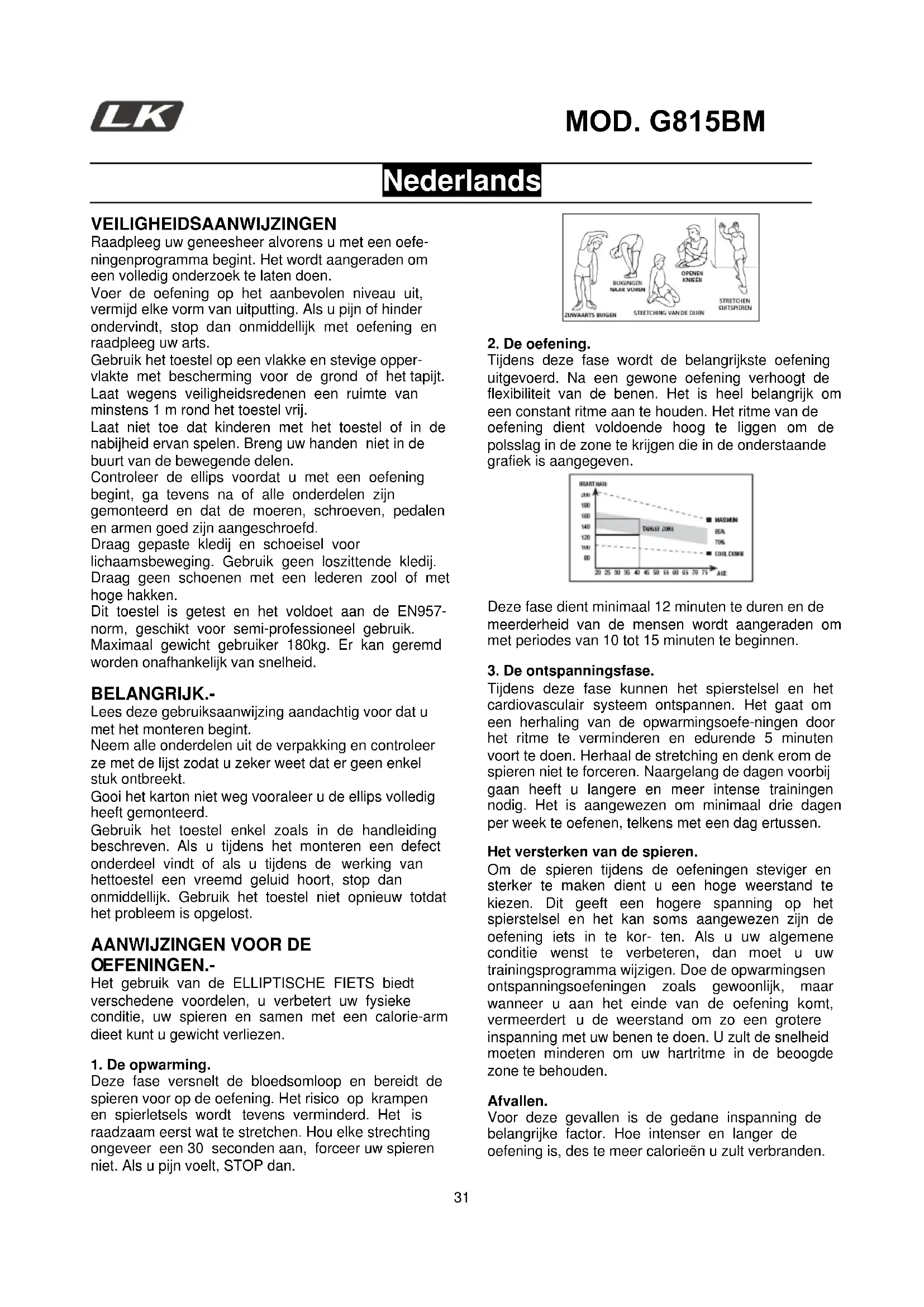Nederlands VEILIGHEIDSAANWIJZINGEN Raadpleeg uw geneesheer alvorens u met een oefe- ningenprogramma begint. Het wordt aangeraden om een volledig onderzoek te laten doen. Voer de oefening op het aanbevolen niveau uit, vermijd elke vorm van uitputting. Als u pijn of hinder ondervindt, stop dan onmiddellijk met oefening en raadpleeg uw arts. Gebruik het toestel op een vlakke en stevige opper- vlakte met bescherming voor de grond of het tapijt. Laat wegens veiligheidsredenen een ruimte van minstens 1 m rond het toestel vrij. Laat niet toe dat kinderen met het toestel of in de nabijheid ervan spelen. Breng uw handen niet in de buurt van de bewegende delen. Controleer de ellips voordat u met een oefening begint, ga tevens na of alle onderdelen zijn gemonteerd en dat de moeren, schroeven, pedalen en armen goed zijn aangeschroefd. Draag gepaste kledij en schoeisel voor lichaamsbeweging. Gebruik geen loszittende kledij. Draag geen schoenen met een lederen zool of met hoge hakken. Dit toestel is getest en het voldoet aan de EN957- norm, geschikt voor semi-professioneel gebruik. Maximaal gewicht gebruiker 180kg. Er kan geremd worden onafhankelijk van snelheid. BELANGRIJK.- Lees deze gebruiksaanwijzing aandachtig voor dat u