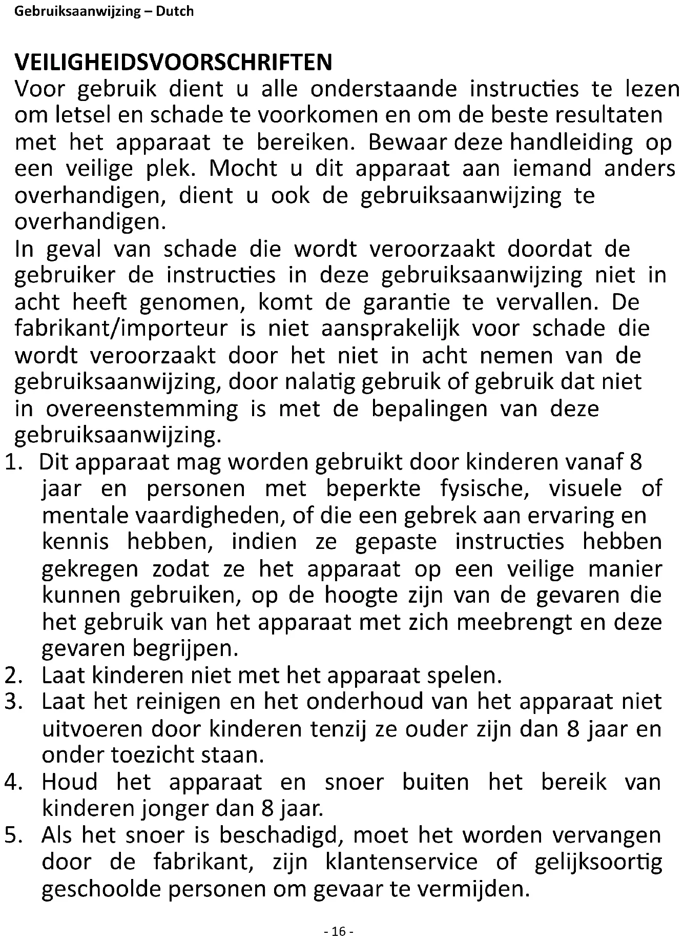 1. Dit apparaat is uitsluitend voor huishoudelijk gebruik.
