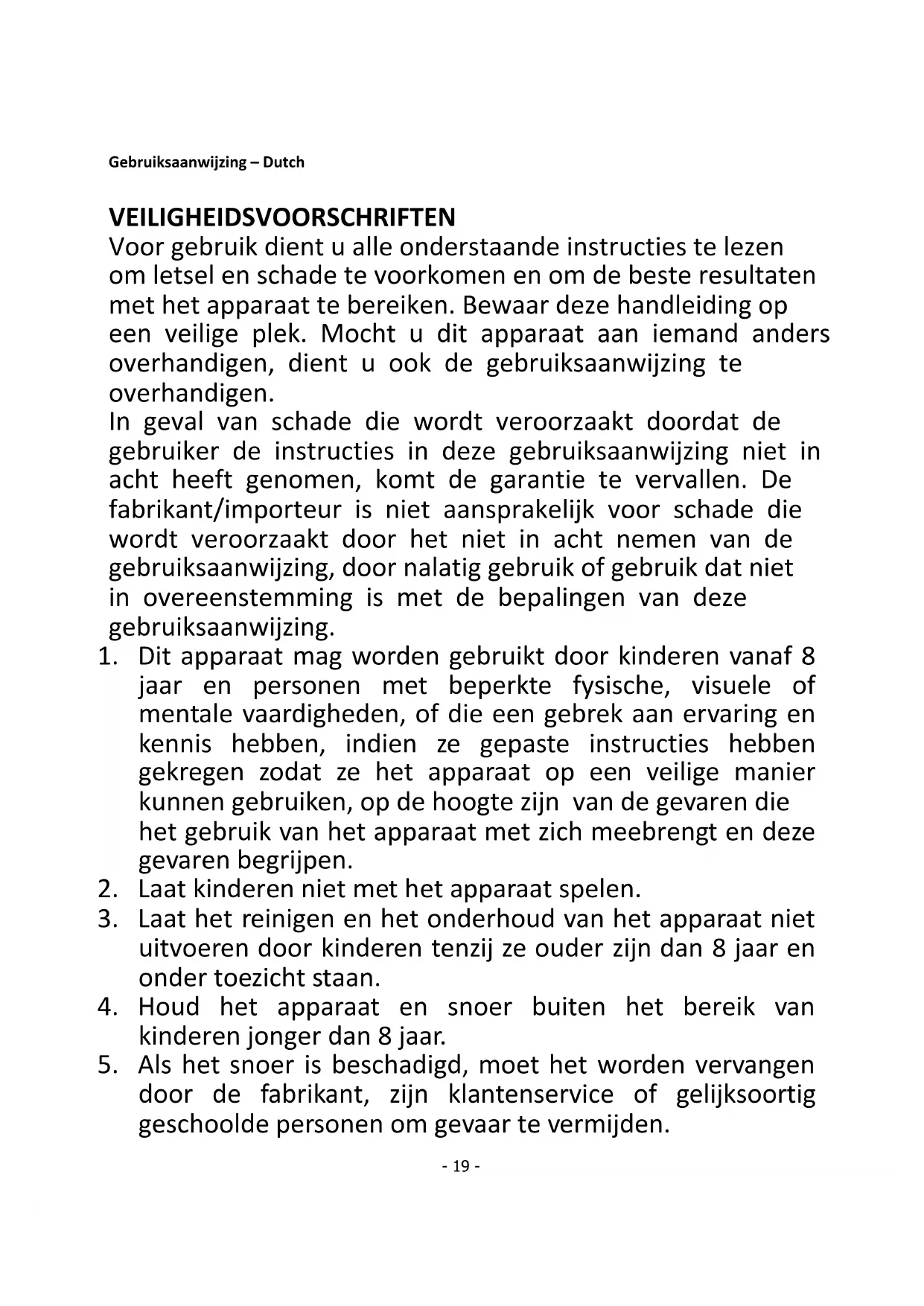 Satisfait aux exigences des directives du Conseil : RÈGLEMENT (UE) N° 66/2014 DE LA COMMISSION du 14 janvier 2014 et modifiant le RÈGLEMENT (UE) 2016/2282 DE LA COMMISSION complétant la directive 2009/125/EC du Parlement européen et du Conseil en ce qui concerne les exigences en matière d'éco-conception des fours, des plaques de cuisson et des hottes domestiques. Spécifications du test : Normes: (CE) No 66/2014; EN 60350-2: 2013 En ce qui concerne les informations pour les consommateurs sur la façon d'installer, d'utiliser et d'entretenir le produit, les informations WEEE et autres les informations pertinentes pour les utilisateurs afin de réduire l'impact environnemental total (par exemple, l'utilisation d'énergie) du processus de cuisson, vérifiez le mode d'emploi fourni avec l'emballage.- 19 - Gebruiksaanwijzing – Dutch VEILIGHEIDSVOORSCHRIFTEN Voor gebruik dient u alle onderstaande instructies te lezen om letsel en schade te voorkomen en om de beste resultaten met het apparaat te bereiken. Bewaar deze handleiding op een veilige plek. Mocht u dit apparaat aan iemand anders overhandigen, dient u ook de gebruiksaanwijzing te overhandigen. In geval van schade die wordt veroorzaakt doordat de gebruiker de instructies in deze gebruiksaanwijzing niet in acht heeft genomen, komt de garantie te vervallen. De fabrikant/importeur is niet aansprakelijk voor schade die wordt veroorzaakt door het niet in acht nemen van de gebruiksaanwijzing, door nalatig gebruik of gebruik dat niet in overeenstemming is met de bepalingen van deze gebruiksaanwijzing.