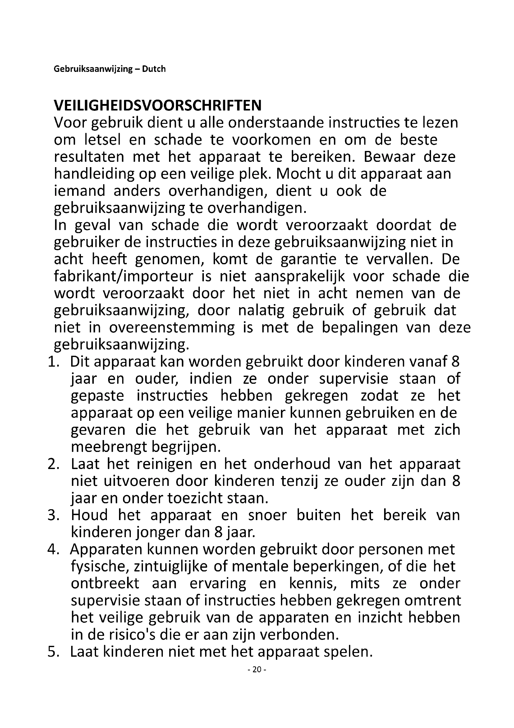 Recyclage – Directive européenne 2012/19/EU Ce symbole indique que le produit ne doit pas être jeté avec les ordures ménagères. Afin d'éviter toute nuisance possible pour l’environnement et la santé humaine causée par les déchets non contrôlés, recyclez ce produit de manière responsable afin de contribuer à la réutilisation des ressources matérielles. Pour retourner votre appareil usagé, utilisez les systèmes de collecte et de retour ou contactez le distributeur auprès duquel le produit a été acheté. Il pourra reprendre ce produit pour qu’il soit recyclé d’une manière respectueuse de l’environnement. Fabriqué par: Emerio Deutschland GmbH Lerchenweg 3, 40789 Monheim am Rhein, Deutschland- 20 - Gebruiksaanwijzing – Dutch VEILIGHEIDSVOORSCHRIFTEN Voor gebruik dient u alle onderstaande instructies te lezen om letsel en schade te voorkomen en om de beste resultaten met het apparaat te bereiken. Bewaar deze handleiding op een veilige plek. Mocht u dit apparaat aan iemand anders overhandigen, dient u ook de gebruiksaanwijzing te overhandigen. In geval van schade die wordt veroorzaakt doordat de gebruiker de instructies in deze gebruiksaanwijzing niet in acht heeft genomen, komt de garantie te vervallen. De fabrikant/importeur is niet aansprakelijk voor schade die wordt veroorzaakt door het niet in acht nemen van de gebruiksaanwijzing, door nalatig gebruik of gebruik dat niet in overeenstemming is met de bepalingen van deze gebruiksaanwijzing.