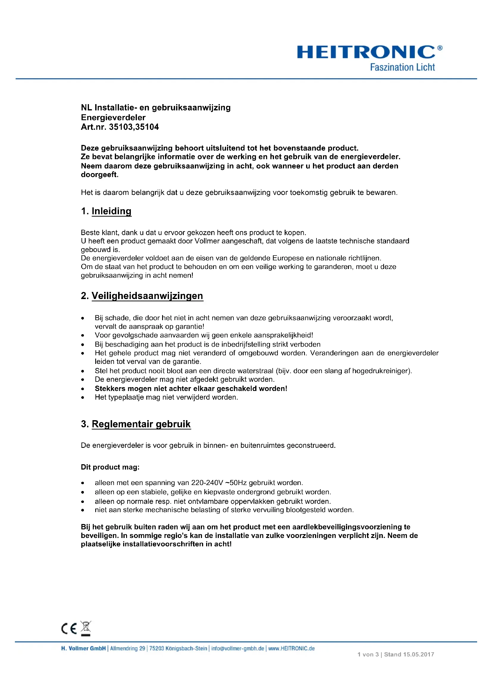 Beste klant, dank u dat u ervoor gekozen heeft ons product te kopen. U heeft een product gemaakt door Vollmer aangeschaft, dat volgens de laatste technische standaard gebouwd is. De energieverdeler voldoet aan de eisen van de geldende Europese en nationale richtlijnen. Om de staat van het product te behouden en om een veilige werking te garanderen, moet u deze gebruiksaanwijzing in acht nemen!