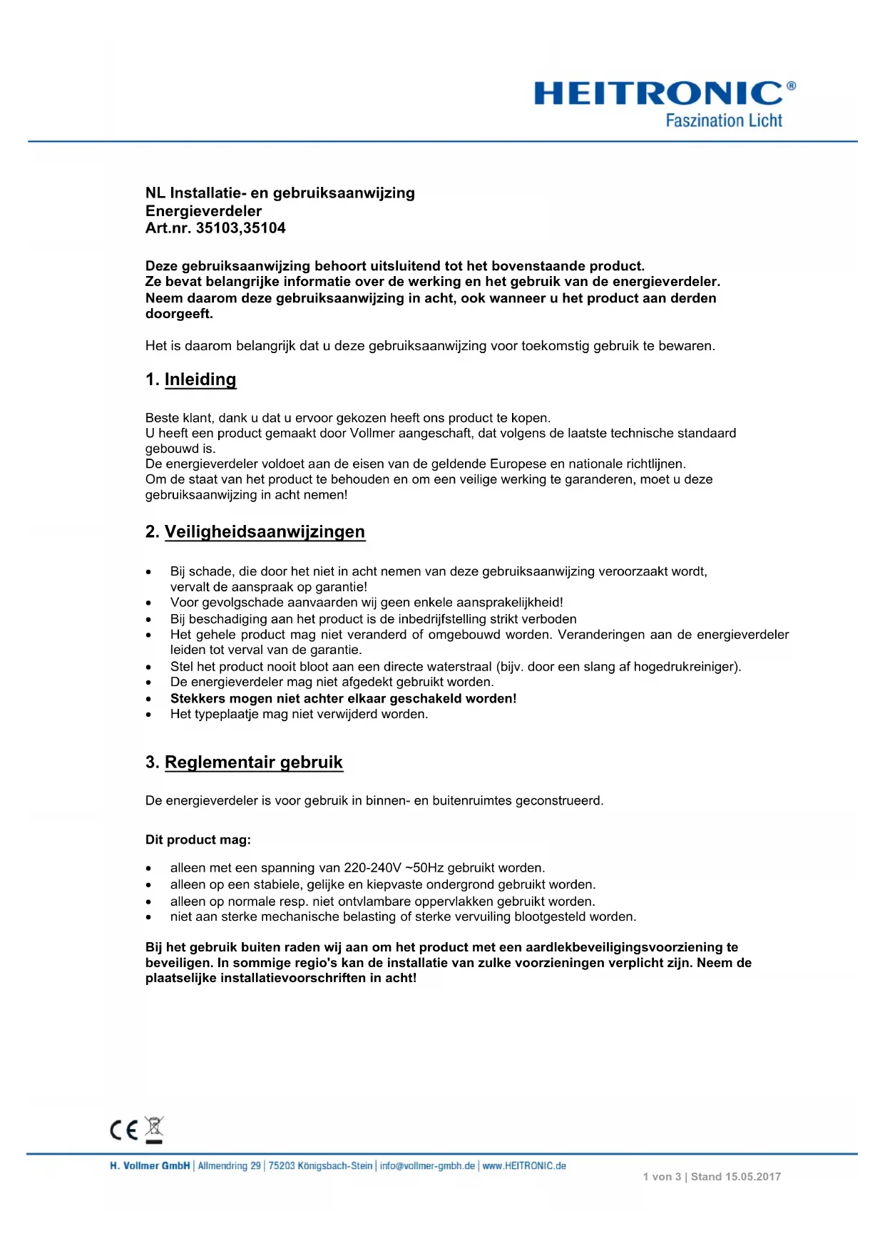 Les vieux appareils électroniques doivent être acheminés aux points de collecte publics et non éliminés comme des déchets ménagers.1 von 3 | Stand 15.05.2017 NL Installatie- en gebruiksaanwijzing Energieverdeler Art.nr. 35103,35104 Deze gebruiksaanwijzing behoort uitsluitend tot het bovenstaande product. Ze bevat belangrijke informatie over de werking en het gebruik van de energieverdeler. Neem daarom deze gebruiksaanwijzing in acht, ook wanneer u het product aan derden doorgeeft. Het is daarom belangrijk dat u deze gebruiksaanwijzing voor toekomstig gebruik te bewaren.