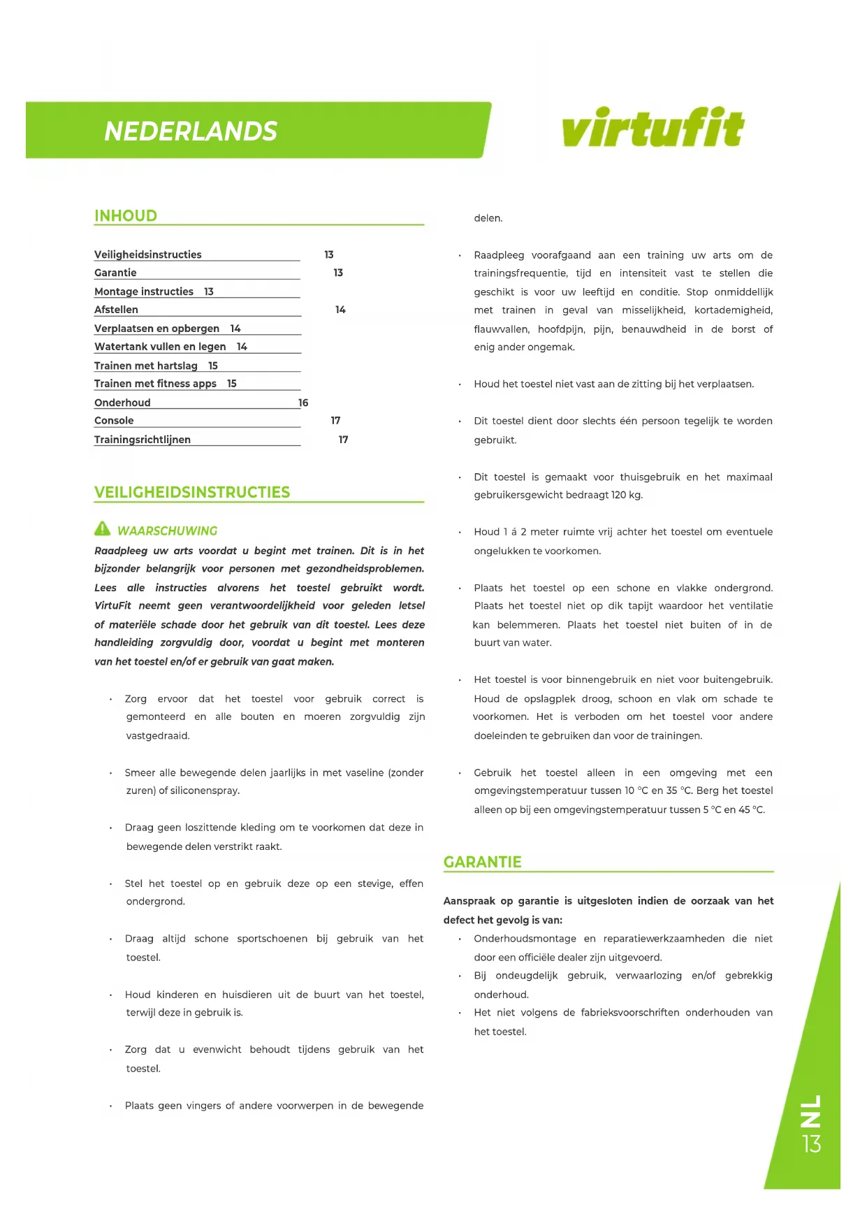 INHOUD Veiligheidsinstructies 13 Garantie 13 Montage instructies 13 Afstellen 14 Verplaatsen en opbergen 14 Watertank vullen en legen 14 Trainen met hartslag 15 Trainen met fitness apps 15 Onderhoud 16 Console 17 Trainingsrichtlijnen 17 VEILIGHEIDSINSTRUCTIES WAARSCHUWING Raadpleeg uw arts voordat u begint met trainen. Dit is in het bijzonder belangrijk voor personen met gezondheidsproblemen. Lees alle instructies alvorens het toestel gebruikt wordt. VirtuFit neemt geen verantwoordelijkheid voor geleden letsel of materiële schade door het gebruik van dit toestel. Lees deze handleiding zorgvuldig door, voordat u begint met monteren van het toestel en/of er gebruik van gaat maken.