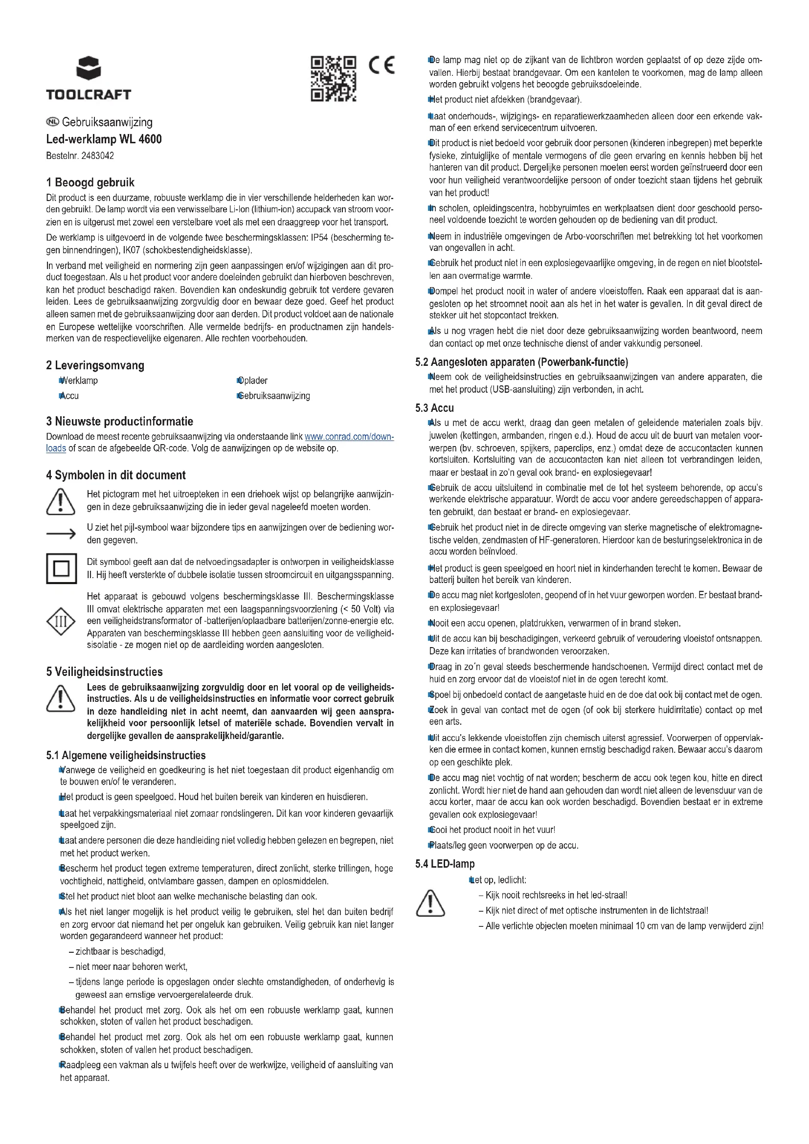 Let op, ledlicht: – Kijk nooit rechtsreeks in het led-straal! – Kijk niet direct of met optische instrumenten in de lichtstraal! – Alle verlichte objecten moeten minimaal 10 cm van de lamp verwijderd zijn! Gebruiksaanwijzing Led-werklamp WL 4600 Bestelnr. 2483042 1 Beoogd gebruik Dit product is een duurzame, robuuste werklamp die in vier verschillende helderheden kan wor- den gebruikt. De lamp wordt via een verwisselbare Li-Ion (lithium-ion) accupack van stroom voor- zien en is uitgerust met zowel een verstelbare voet als met een draaggreep voor het transport. De werklamp is uitgevoerd in de volgende twee beschermingsklassen: IP54 (bescherming te- gen binnendringen), IK07 (schokbestendigheidsklasse). In verband met veiligheid en normering zijn geen aanpassingen en/of wijzigingen aan dit pro- duct toegestaan. Als u het product voor andere doeleinden gebruikt dan hierboven beschreven, kan het product beschadigd raken. Bovendien kan ondeskundig gebruik tot verdere gevaren leiden. Lees de gebruiksaanwijzing zorgvuldig door en bewaar deze goed. Geef het product alleen samen met de gebruiksaanwijzing door aan derden. Dit product voldoet aan de nationale en Europese wettelijke voorschriften. Alle vermelde bedrijfs- en productnamen zijn handels- merken van de respectievelijke eigenaren. Alle rechten voorbehouden. 2 Leveringsomvang
