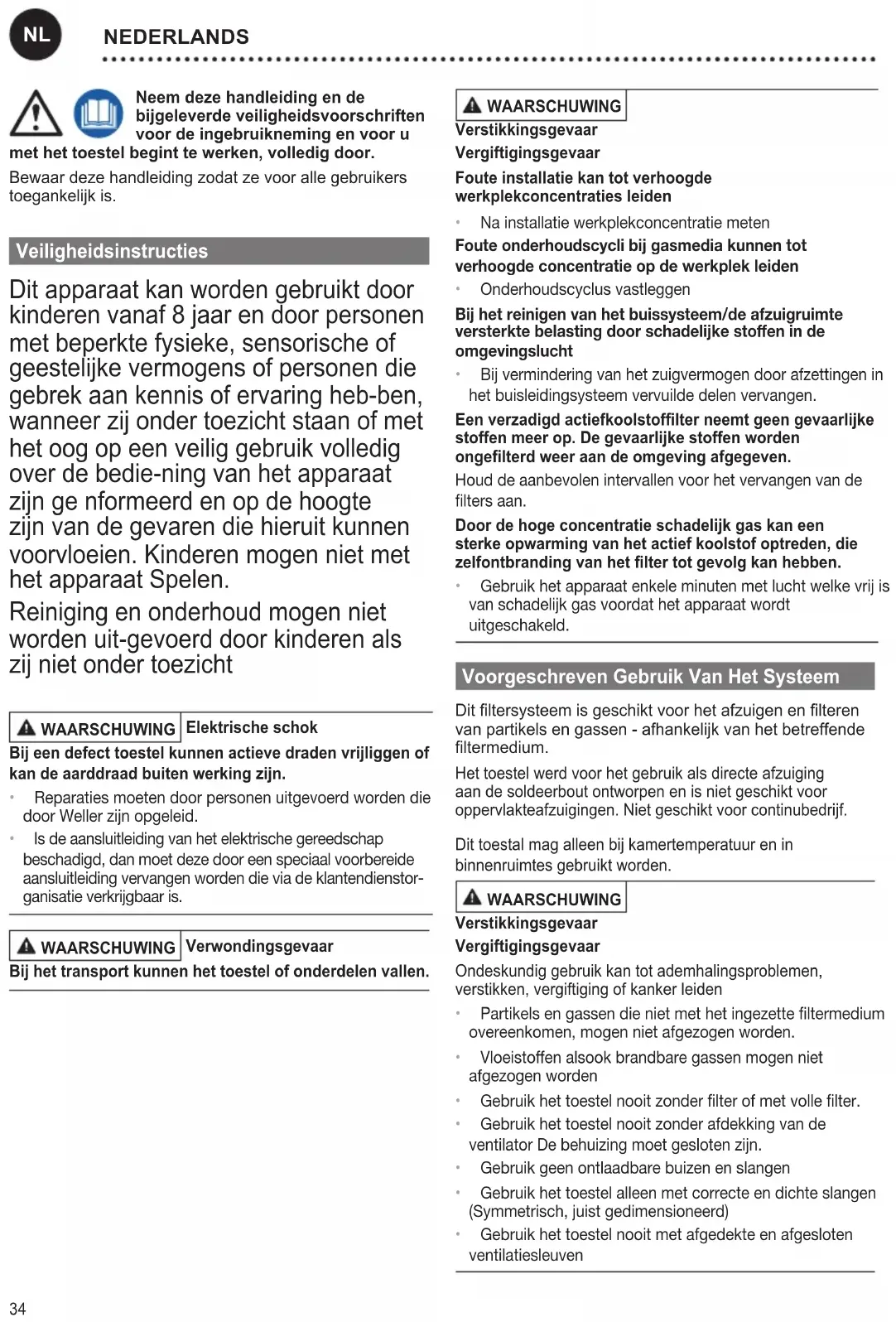 - Gebruikhetapparaatenkeleminutenmetluchtwelkevrijis vanschadelijkgasvoordathetapparaatwordt uitgeschakeld. Voorgeschreven Gebruik Van Het Systeem Dit ltersysteem is geschikt voor het afzuigen en lteren van partikels en gassen - afhankelijk van het betreffende ltermedium. Het toestel werd voor het gebruik als directe afzuiging aan de soldeerbout ontworpen en is niet geschikt voor oppervlakteafzuigingen. Niet geschikt voor continubedrijf. Dit toestal mag alleen bij kamertemperatuur en in binnenruimtes gebruikt worden. WAARSCHUWING Verstikkingsgevaar Vergiftigingsgevaar Ondeskundig gebruik kan tot ademhalingsproblemen, verstikken, vergiftiging of kanker leiden