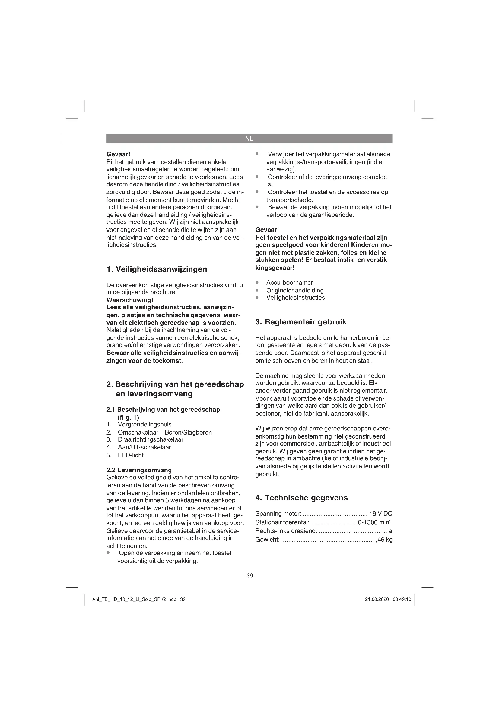 Het LED-licht (5) maakt het verlichten van de plaats waar u moet schroeven of boren mogelijk als er niet voldoende licht is. Het LED-licht (5) gaat automatisch branden, zodra u op de Aan/ Uit-schakelaar (4) drukt. Anl_TE_HD_18_12_Li_Solo_SPK2.indb 41Anl_TE_HD_18_12_Li_Solo_SPK2.indb 41 21.08.2020 08:49:1021.08.2020 08:49:10NL