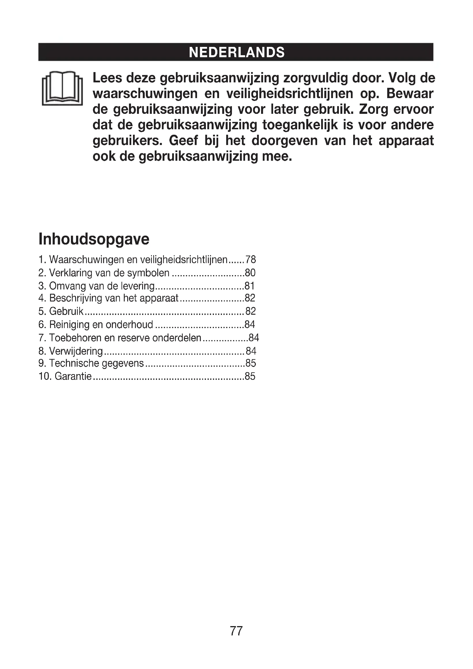 Szczegółowe informacje na temat gwarancji iwarunków gwarancji znajdują się wzałączo- nej ulotce gwarancyjnej. Zastrzega się prawo do pomyłek izmian.77 Lees deze gebruiksaanwijzing zorgvuldig door. Volg de waarschuwingen en veiligheidsrichtlijnen op. Bewaar de gebruiksaanwijzing voor later gebruik. Zorg ervoor dat de gebruiksaanwijzing toegankelijk is voor andere gebruikers. Geef bij het doorgeven van het apparaat ook de gebruiksaanwijzing mee. NEDERLANDS Inhoudsopgave