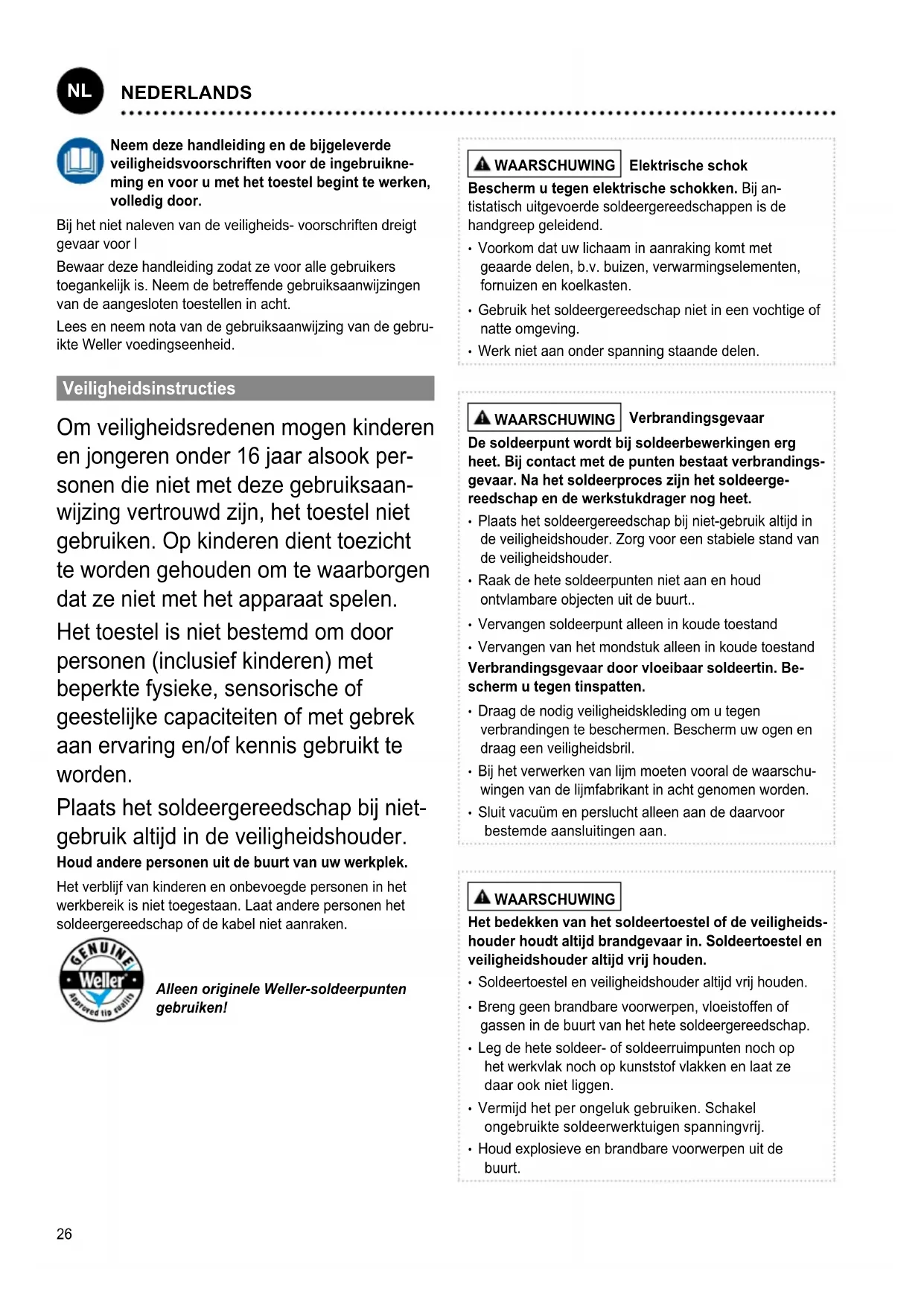 NEDERLANDS Bewaar uw soldeergereedschap op een veilige plek. Ongebruikte toestellen en gereedschappen moeten op een droge, hoog gelegen of afgesloten plaats buiten het bereik van kinderen bewaard worden. Schakel ongebruikte soldeerwerktuigen spannings- en drukvrij. Gebruik de kabel niet voor toepassingen waarvoor het niet bestemd is. Draag het toestel nooit aan de kabel. Gebruik de kabel niet om de stekker uit het stopcontact te trekken. Bescherm de kabel tegen hitte, olie en scherpe randen. Wees aandachtig. Let erop wat u doet. Ga met verstand aan het werk. Gebruik het soldeergereedschap niet als u niet geconcentreerd bent. Vermijd abnormale lichaamshouding. Zorg voor een ergonomische werkplek. Vermijd houdingsfouten bij het werken, houdingsfouten veroorzaken houdingsschade. Het soldeergereedschap mag enkel in een technisch perfecte staat in gebruik genomen worden. Veiligheidsin- richtingen mogen niet buiten bedrijf gesteld worden. Storingen en defecten moeten onmiddellijk verholpen worden. Voor elk gebruik van het toestel/werktuig moeten veiligheidsinrichtingen zorgvuldig op hun perfecte en reglementaire werking onderzocht worden. Controleer of de bewegende delen perfect functioneren en niet klemmen en of delen beschadigd zijn. Alle delen moeten juist gemonteerd zijn en aan alle voorwaarden voldoen om het perfecte gebru- ik van het toestel te garanderen. Gebruik het juiste werktuig. Gebruik alleen toebehoren of hulptoestellen die in de toebehorenlijst vermeld of door de fabrikant vrijgegeven zijn. Gebruik WELLER toebehoren of hulptoestellen alleen aan originele WELLER-toestellen. Het gebruik van andere werktuigen en ander toebehoren kan verwondingsgevaar voor u betekenen. Beveilig het werktuig. Gebruik spaninrichtingen om het werkstuk vast te houden. Gebruik een soldeerrookafzuiging. Als inrichtingen voor het aansluiten van soldeerrookafzuigingen voorhanden zijn, controleer dan of deze aangesloten en juist gebruikt worden. Voorgeschreven Gebruik Van Het Systeem Gebruik de soldeerbout uitsluitend conform de in de gebru- iksaanwijzing beschreven bestemming voor het solderen en soldeerruimen onder de hier opgegeven omstandigheden. De soldeerbout mag alleen met de Weller voedingseenhe- den gebruikt worden. Dit toestal mag alleen bij kamertemperatuur en in binnen- ruimtes gebruikt worden. Tegen vocht en direct zonlicht beschermen. Gebruikersgroepen Wegens verschillend hoge risico‘s en gevaren mogen som- mige handelingen alleen door geschoolde vaklui uitgevoerd worden. Handeling Gebruikersgroepen Opgave van de soldeerpa- rameters Vakpersoneel met technische opleiding Vervangen van elektrische reserveonderdelen Elektrotechnicus Opgave van onderhouds- intervallen Veiligheidskracht Bedienen Wissel van de lter Leek Bedienen Wissel van de lter Vervangen van elektrische reserveonderdelen Technische leerling onder leiding en toezicht van een opgeleide vakman onderhouden WAARSCHUWING Voor alle werkzaamheden aan het apparaat de stekker uit het stopcontact nemen. Toestel laten afkoelen. Controleer regelmatig alle aangesloten kabels en slangen. Beschadigde elektrische gereedschappen onmiddellijk buiten bedrijf stellen. Verstopte mondstukken mogen niet gebruikt worden. Reparaties moeten door personen uitgevoerd worden die door Weller zijn opgeleid. Gebruik alléén origineel toebehoren en originele onderdelen. WAARSCHUWING Verbrandingsgevaar