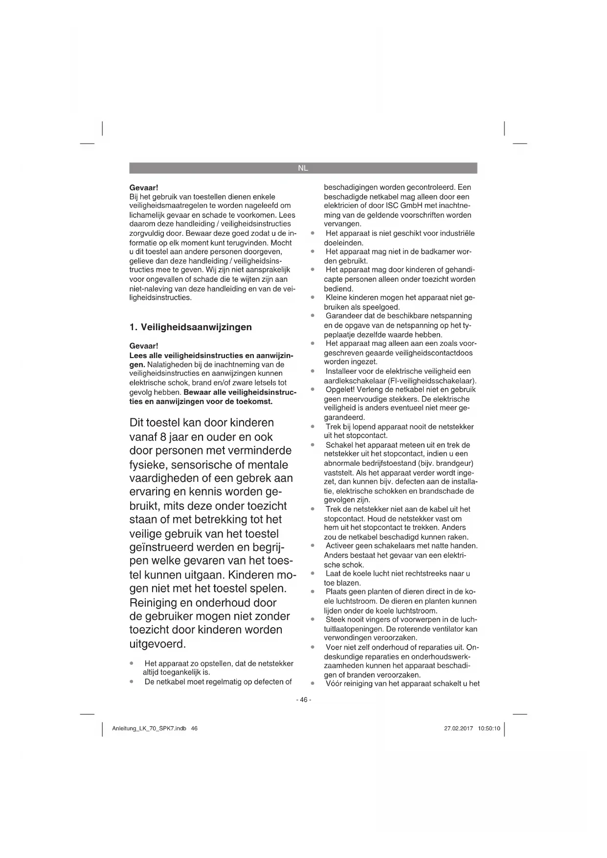 Het apparaat is bedoeld voor de koeling van de lucht in gesloten ruimtes. De koeling van de uitgeblazen lucht wordt daarbij bereikt door de verdamping van gekoeld water uit de watertank van het apparaat. De machine mag slechts voor werkzaamheden worden gebruikt waarvoor ze bedoeld is. Elk ander verder gaand gebruik is niet reglementair. Voor daaruit voortvloeiende schade of verwon- dingen van welke aard dan ook is de gebruiker/ bediener, niet de fabrikant, aansprakelijk. Wij wijzen erop dat onze gereedschappen overe- enkomstig hun bestemming niet geconstrueerd zijn voor commercieel, ambachtelijk of industrieel gebruik. Wij geven geen garantie indien het ge- reedschap in ambachtelijke of industriële bedrij- ven alsmede bij gelijk te stellen activiteiten wordt gebruikt. Tips voor energiebesparing bij het koelen Sluit ramen, deuren en jaloezieën om de instra- ling van zonlicht zoveel mogelijk te verhinderen. Anleitung_LK_70_SPK7.indb 47Anleitung_LK_70_SPK7.indb 47 27.02.2017 10:50:1027.02.2017 10:50:10NL