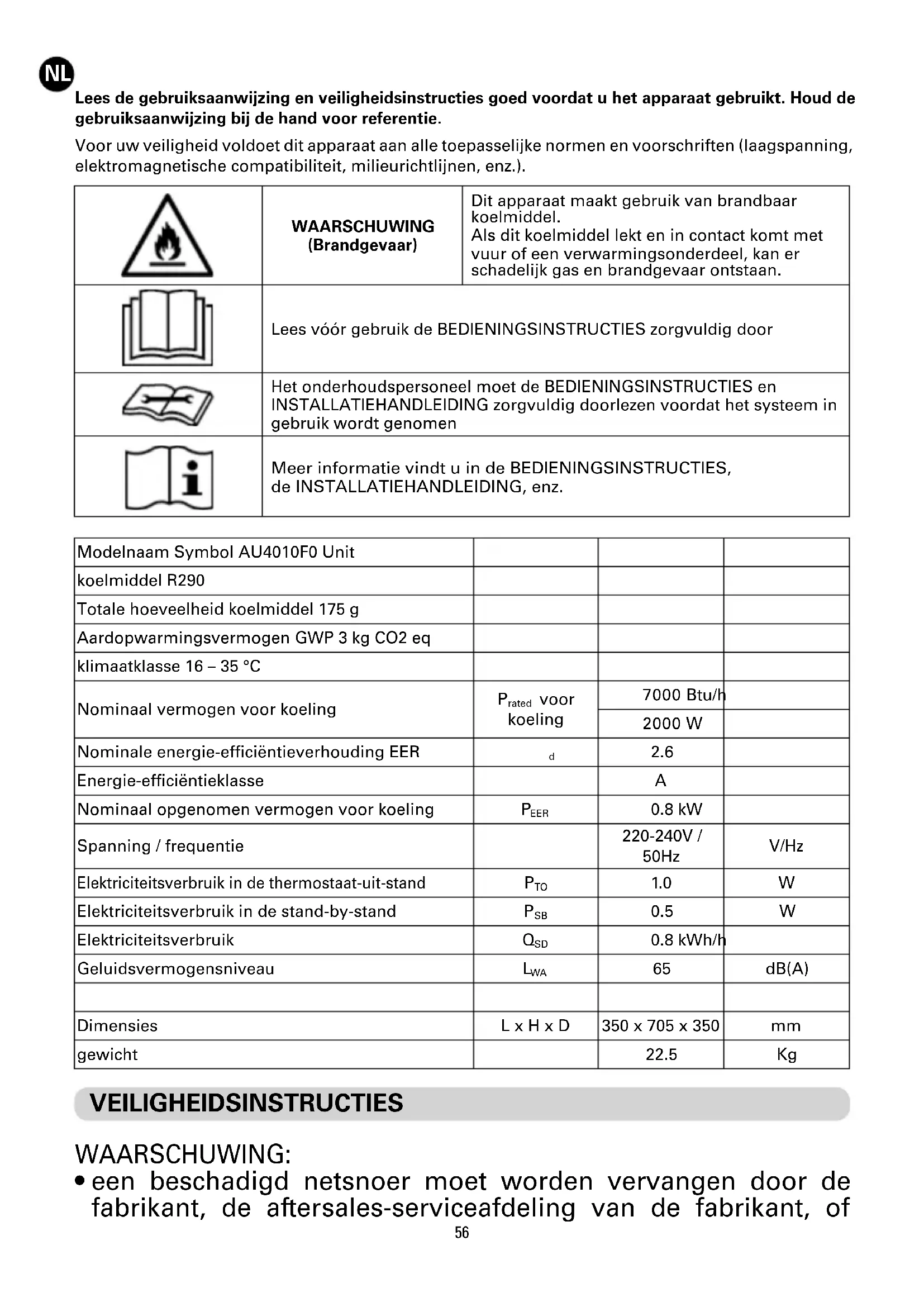 Lees de gebruiksaanwijzing en veiligheidsinstructies goed voordat u het apparaat gebruikt. Houd de gebruiksaanwijzing bij de hand voor referentie. Voor uw veiligheid voldoet dit apparaat aan alle toepasselijke normen en voorschriften (laagspanning, elektromagnetische compatibiliteit, milieurichtlijnen, enz.). WAARSCHUWING (Brandgevaar) Dit apparaat maakt gebruik van brandbaar koelmiddel. Als dit koelmiddel lekt en in contact komt met vuur of een verwarmingsonderdeel, kan er schadelijk gas en brandgevaar ontstaan. Lees vóór gebruik de BEDIENINGSINSTRUCTIES zorgvuldig door Het onderhoudspersoneel moet de BEDIENINGSINSTRUCTIES en INSTALLATIEHANDLEIDING zorgvuldig doorlezen voordat het systeem in gebruik wordt genomen Meer informatie vindt u in de BEDIENINGSINSTRUCTIES, de INSTALLATIEHANDLEIDING, enz. Modelnaam Symbol AU4010F0 Unit koelmiddel R290 Totale hoeveelheid koelmiddel 175 g Aardopwarmingsvermogen GWP 3 kg CO2 eq klimaatklasse 16 – 35 °C Nominaal vermogen voor koeling