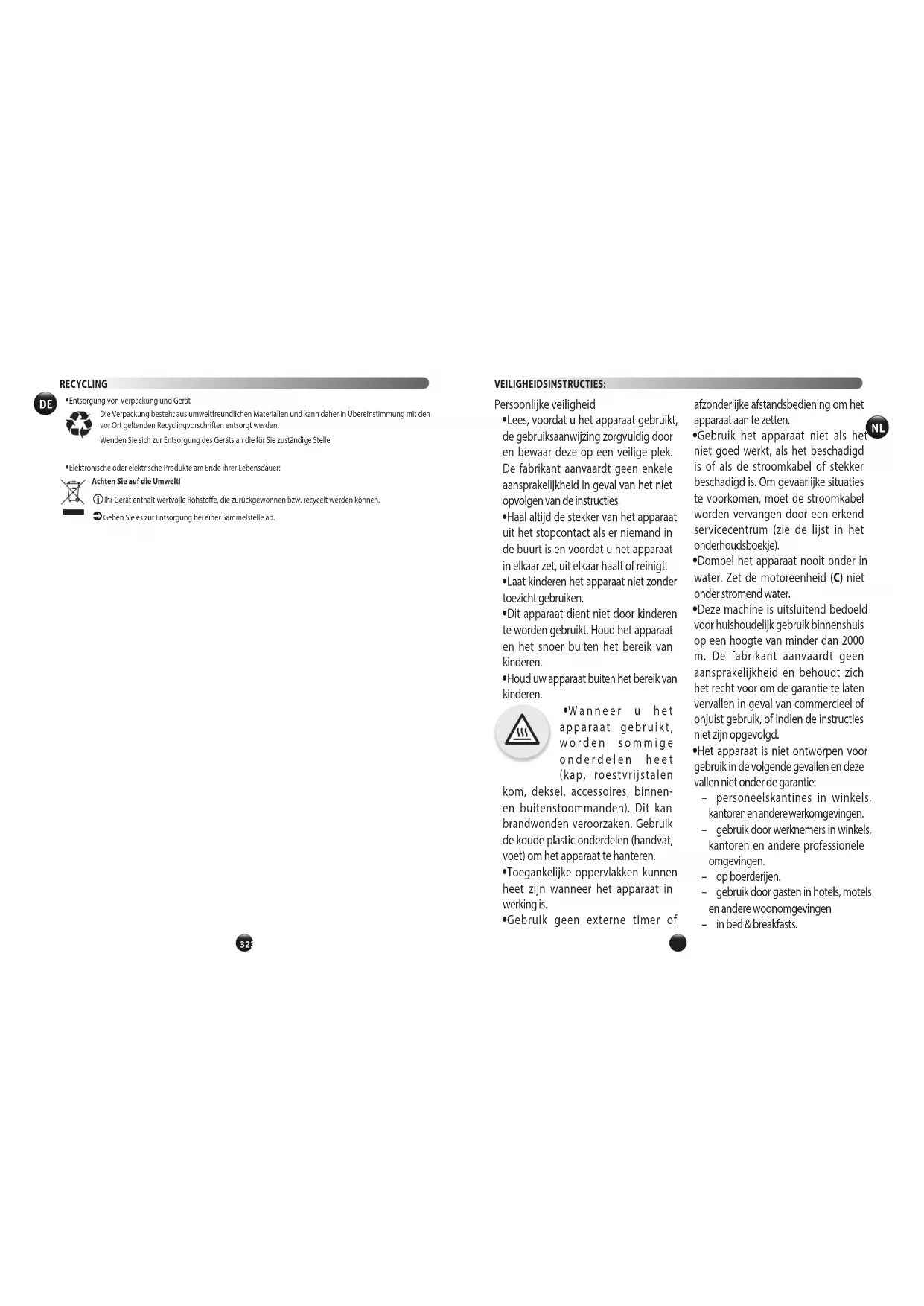 - Het apparaat is niet ontworpen voor gebruik in de volgende gevallen en deze vallen niet onder de garantie: – personeelskantines in winkels, kantoren en andere werkomgevingen. – gebruik door werknemers in winkels, kantoren en andere professionele omgevingen. – op boerderijen. – gebruik door gasten in hotels, motels en andere woonomgevingen – in bed & breakfasts. VEILIGHEIDSINSTRUCTIES:34 35 NLNL