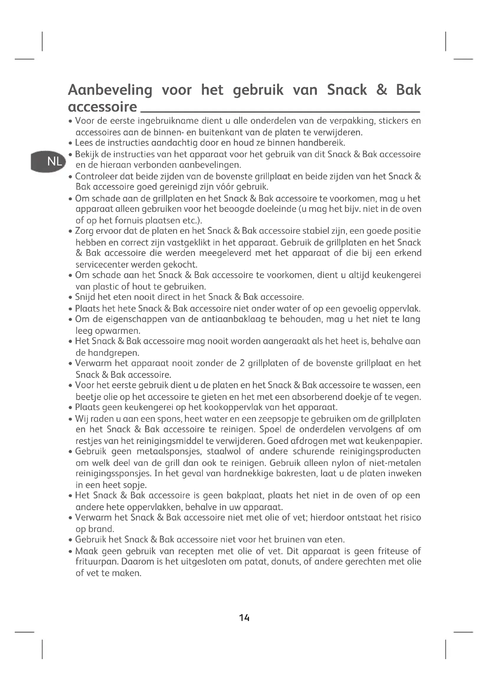 - Om schade aan de grillplaten en het Snack & Bak accessoire te voorkomen, mag u het apparaat alleen gebruiken voor het beoogde doeleinde (u mag het bijv. niet in de oven of op het fornuis plaatsen etc.).