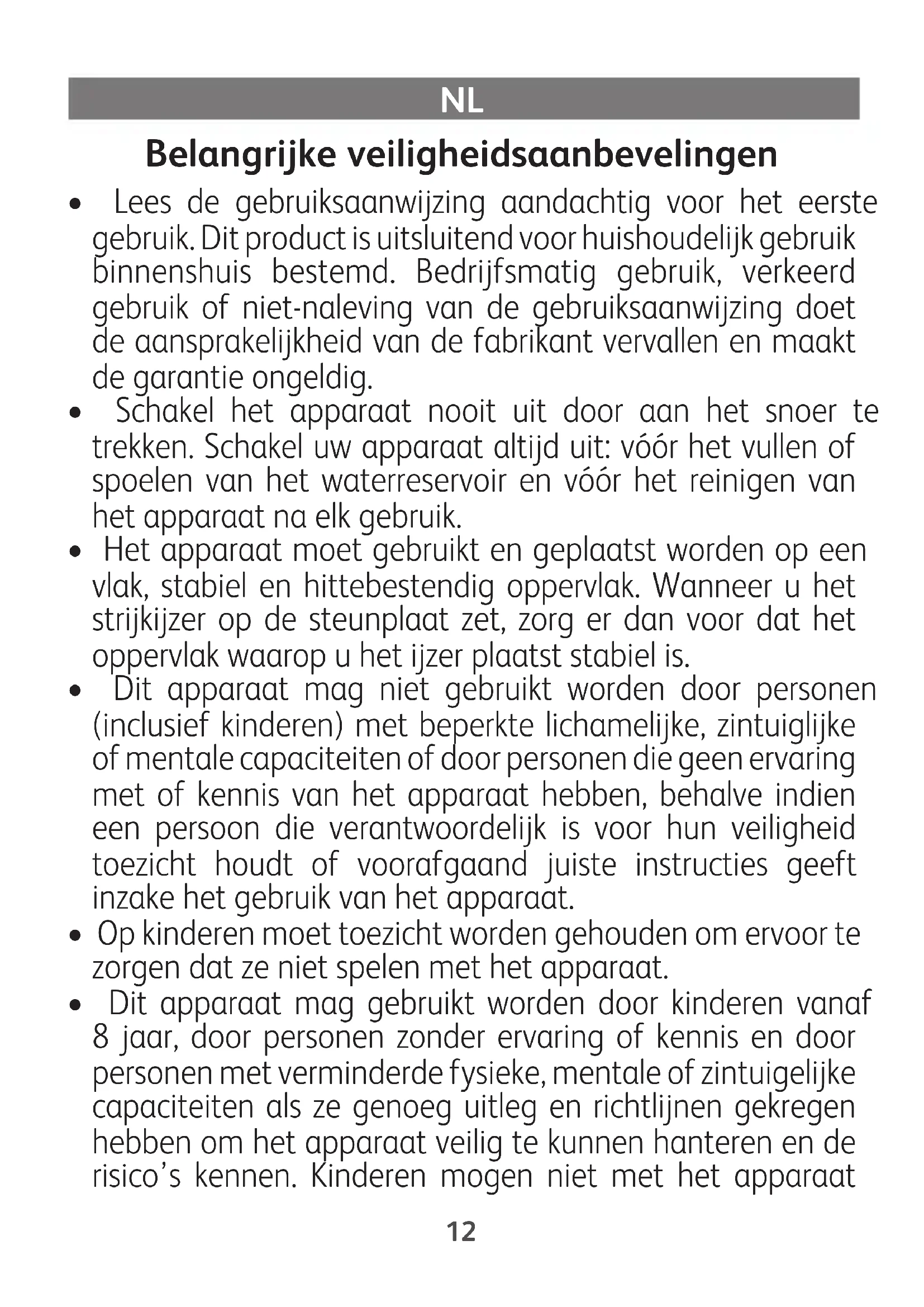 - Dit apparaat mag gebruikt worden door kinderen vanaf 8 jaar, door personen zonder ervaring of kennis en door personen met verminderde fysieke, mentale of zintuigelijke capaciteiten als ze genoeg uitleg en richtlijnen gekregen hebben om het apparaat veilig te kunnen hanteren en de risico’s kennen. Kinderen mogen niet met het apparaat 12spelen. Kinderen mogen het apparaat niet zonder toezicht reinigen of onderhouden. Houd het strijkijzer en het snoer buiten bereik van kinderen jonger dan 8 jaar wanneer het apparaat onder stroom staat of afkoelt.