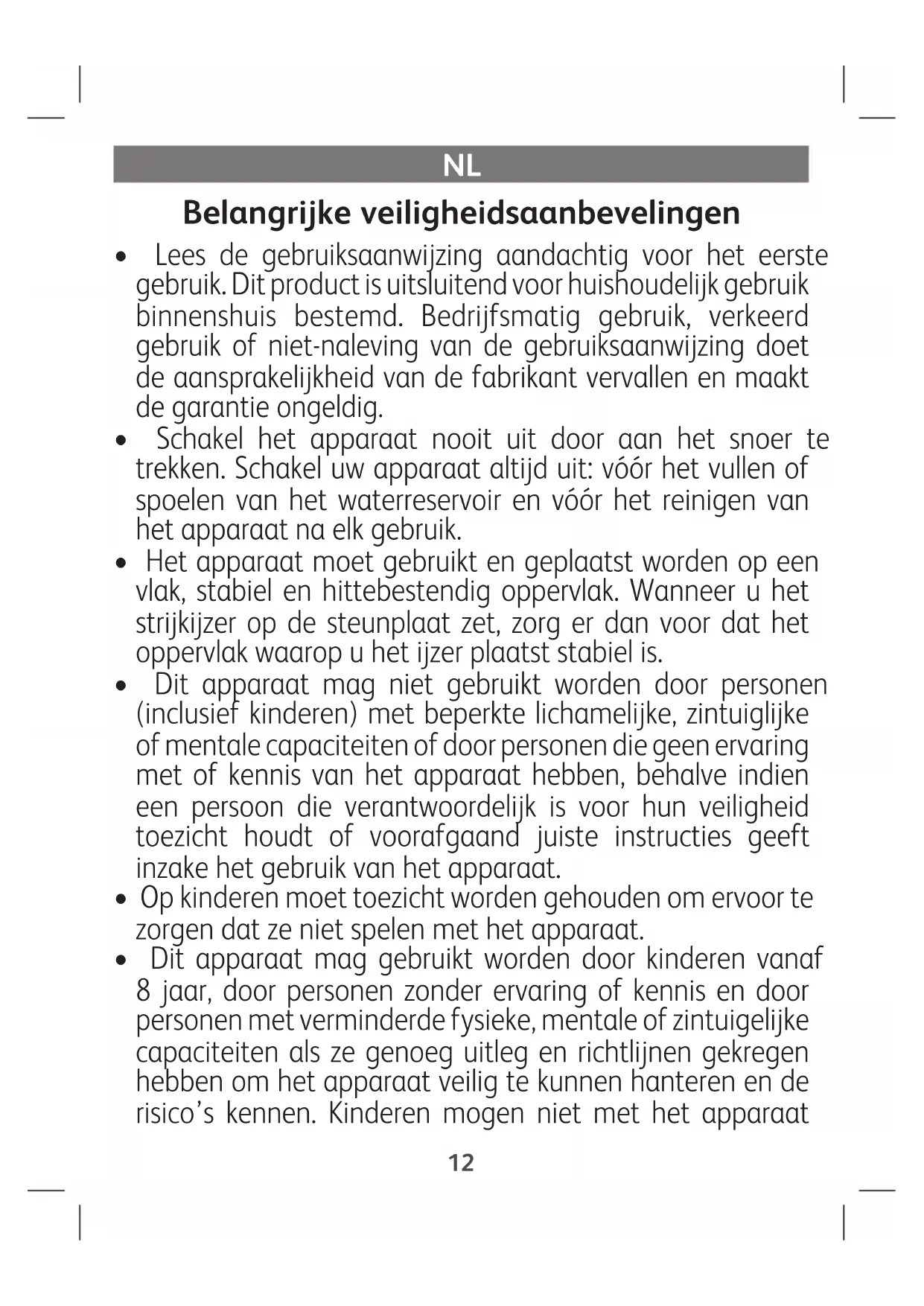 - Dit apparaat mag gebruikt worden door kinderen vanaf 8 jaar, door personen zonder ervaring of kennis en door personen met verminderde fysieke, mentale of zintuigelijke capaciteiten als ze genoeg uitleg en richtlijnen gekregen hebben om het apparaat veilig te kunnen hanteren en de risico’s kennen. Kinderen mogen niet met het apparaat 12spelen. Kinderen mogen het apparaat niet zonder toezicht reinigen of onderhouden. Houd het strijkijzer en het snoer buiten bereik van kinderen jonger dan 8 jaar wanneer het apparaat onder stroom staat of afkoelt.