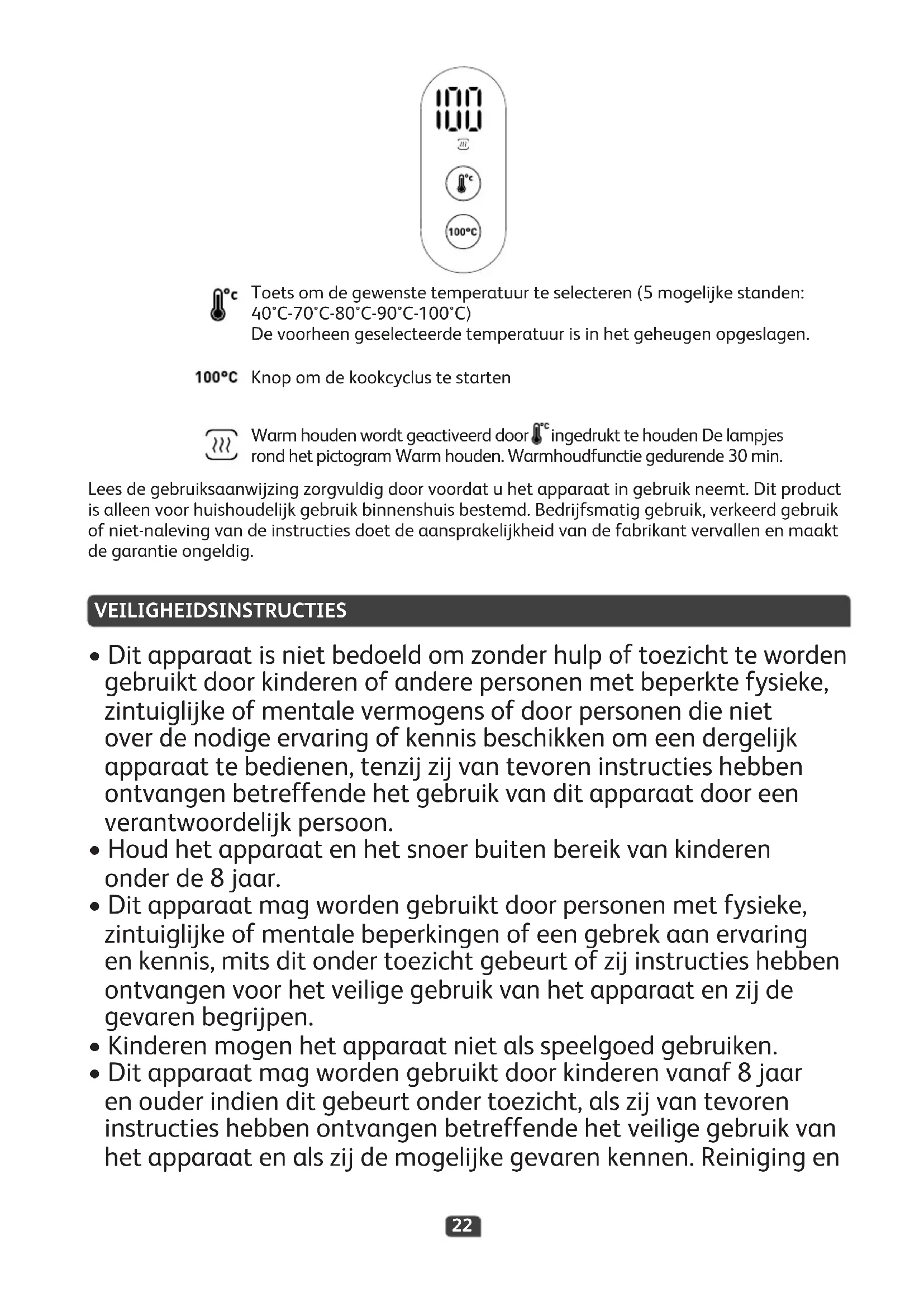 - Dit apparaat mag worden gebruikt door kinderen vanaf 8 jaar en ouder indien dit gebeurt onder toezicht, als zij van tevoren instructies hebben ontvangen betreffende het veilige gebruik van het apparaat en als zij de mogelijke gevaren kennen. Reiniging en VEILIGHEIDSINSTRUCTIES Lees de gebruiksaanwijzing zorgvuldig door voordat u het apparaat in gebruik neemt. Dit product is alleen voor huishoudelijk gebruik binnenshuis bestemd. Bedrijfsmatig gebruik, verkeerd gebruik of niet-naleving van de instructies doet de aansprakelijkheid van de fabrikant vervallen en maakt de garantie ongeldig. Toets om de gewenste temperatuur te selecteren (5 mogelijke standen: 40°C-70°C-80°C-90°C-100°C) De voorheen geselecteerde temperatuur is in het geheugen opgeslagen. Knop om de kookcyclus te starten Warm houden wordt geactiveerd door ingedrukt te houden De lampjes rond het pictogram Warm houden. Warmhoudfunctie gedurende 30 min.23 onderhoud mogen niet worden uitgevoerd door kinderen tenzij ze 8jaar of ouder zijn en onder toezicht van een volwassene staan.