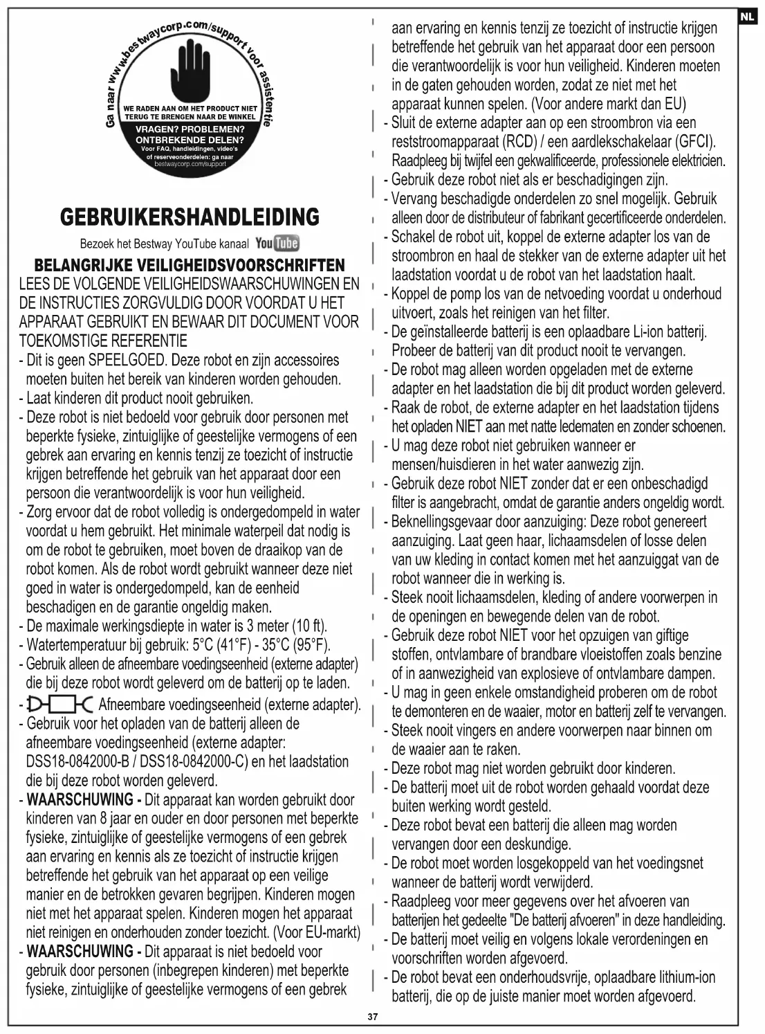 Gebruik alleen de afneembare voedingseenheid (externe adapter) die bij deze robot wordt geleverd om de batterij op te laden. - Afneembare voedingseenheid (externe adapter). - Gebruik voor het opladen van de batterij alleen de afneembare voedingseenheid (externe adapter: DSS18-0842000-B / DSS18-0842000-C) en het laadstation die bij deze robot worden geleverd. - WAARSCHUWING - Dit apparaat kan worden gebruikt door kinderen van 8 jaar en ouder en door personen met beperkte fysieke, zintuiglijke of geestelijke vermogens of een gebrek aan ervaring en kennis als ze toezicht of instructie krijgen betreffende het gebruik van het apparaat op een veilige manier en de betrokken gevaren begrijpen. Kinderen mogen niet met het apparaat spelen. Kinderen mogen het apparaat niet reinigen en onderhouden zonder toezicht. (Voor EU-markt) - WAARSCHUWING - Dit apparaat is niet bedoeld voor gebruik door personen (inbegrepen kinderen) met beperkte fysieke, zintuiglijke of geestelijke vermogens of een gebrek aan ervaring en kennis tenzij ze toezicht of instructie krijgen betreffende het gebruik van het apparaat door een persoon die verantwoordelijk is voor hun veiligheid. Kinderen moeten in de gaten gehouden worden, zodat ze niet met het apparaat kunnen spelen. (Voor andere markt dan EU) - Sluit de externe adapter aan op een stroombron via een reststroomapparaat (RCD) / een aardlekschakelaar (GFCI). Raadpleeg bij twijfel een gekwalificeerde, professionele elektricien. - Gebruik deze robot niet als er beschadigingen zijn. - Vervang beschadigde onderdelen zo snel mogelijk. Gebruik alleen door de distributeur of fabrikant gecertificeerde onderdelen. - Schakel de robot uit, koppel de externe adapter los van de stroombron en haal de stekker van de externe adapter uit het laadstation voordat u de robot van het laadstation haalt. - Koppel de pomp los van de netvoeding voordat u onderhoud uitvoert, zoals het reinigen van het filter. - De geïnstalleerde batterij is een oplaadbare Li-ion batterij. Probeer de batterij van dit product nooit te vervangen. - De robot mag alleen worden opgeladen met de externe adapter en het laadstation die bij dit product worden geleverd. - Raak de robot, de externe adapter en het laadstation tijdens het opladen NIET aan met natte ledematen en zonder schoenen. - U mag deze robot niet gebruiken wanneer er mensen/huisdieren in het water aanwezig zijn. - Gebruik deze robot NIET zonder dat er een onbeschadigd filter is aangebracht, omdat de garantie anders ongeldig wordt. - Beknellingsgevaar door aanzuiging: Deze robot genereert aanzuiging. Laat geen haar, lichaamsdelen of losse delen van uw kleding in contact komen met het aanzuiggat van de robot wanneer die in werking is. - Steek nooit lichaamsdelen, kleding of andere voorwerpen in de openingen en bewegende delen van de robot. - Gebruik deze robot NIET voor het opzuigen van giftige stoffen, ontvlambare of brandbare vloeistoffen zoals benzine of in aanwezigheid van explosieve of ontvlambare dampen. - U mag in geen enkele omstandigheid proberen om de robot te demonteren en de waaier, motor en batterij zelf te vervangen. - Steek nooit vingers en andere voorwerpen naar binnen om de waaier aan te raken. - Deze robot mag niet worden gebruikt door kinderen. - De batterij moet uit de robot worden gehaald voordat deze buiten werking wordt gesteld. - Deze robot bevat een batterij die alleen mag worden vervangen door een deskundige. - De robot moet worden losgekoppeld van het voedingsnet wanneer de batterij wordt verwijderd. - Raadpleeg voor meer gegevens over het afvoeren van batterijen het gedeelte "De batterij afvoeren" in deze handleiding. - De batterij moet veilig en volgens lokale verordeningen en voorschriften worden afgevoerd. - De robot bevat een onderhoudsvrije, oplaadbare lithium-ion batterij, die op de juiste manier moet worden afgevoerd. Recycling is vereist; neem contact op met uw plaatselijke overheid voor meer informatie. - Externe adapter en laadstation: