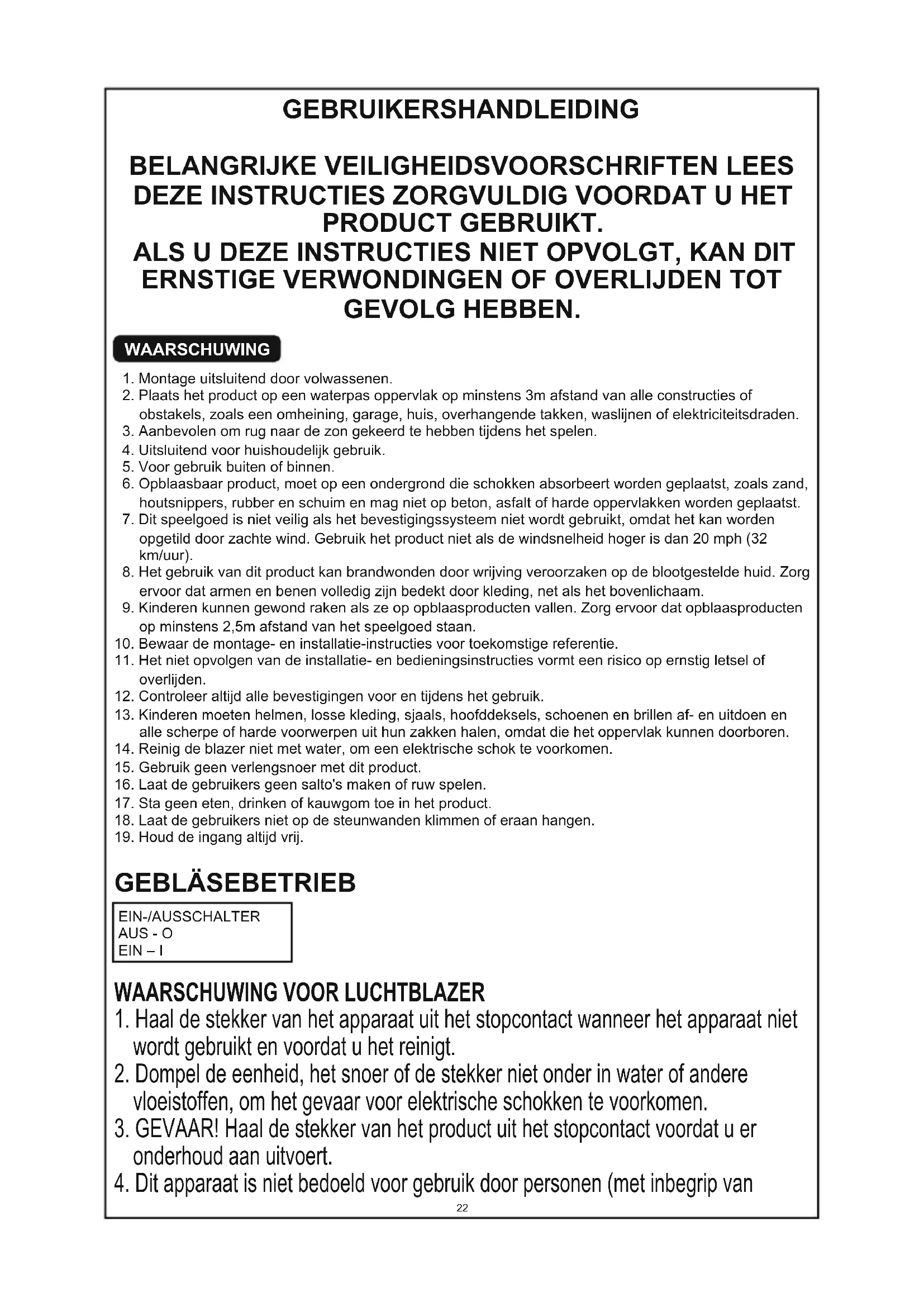 moeten in de grond worden gedreven om het gevaar voor struikelen en vallen te verminderen. Let op: Na het opblazen moet de blazer blijven werken zolang de kinderen aan het spelen zijn.