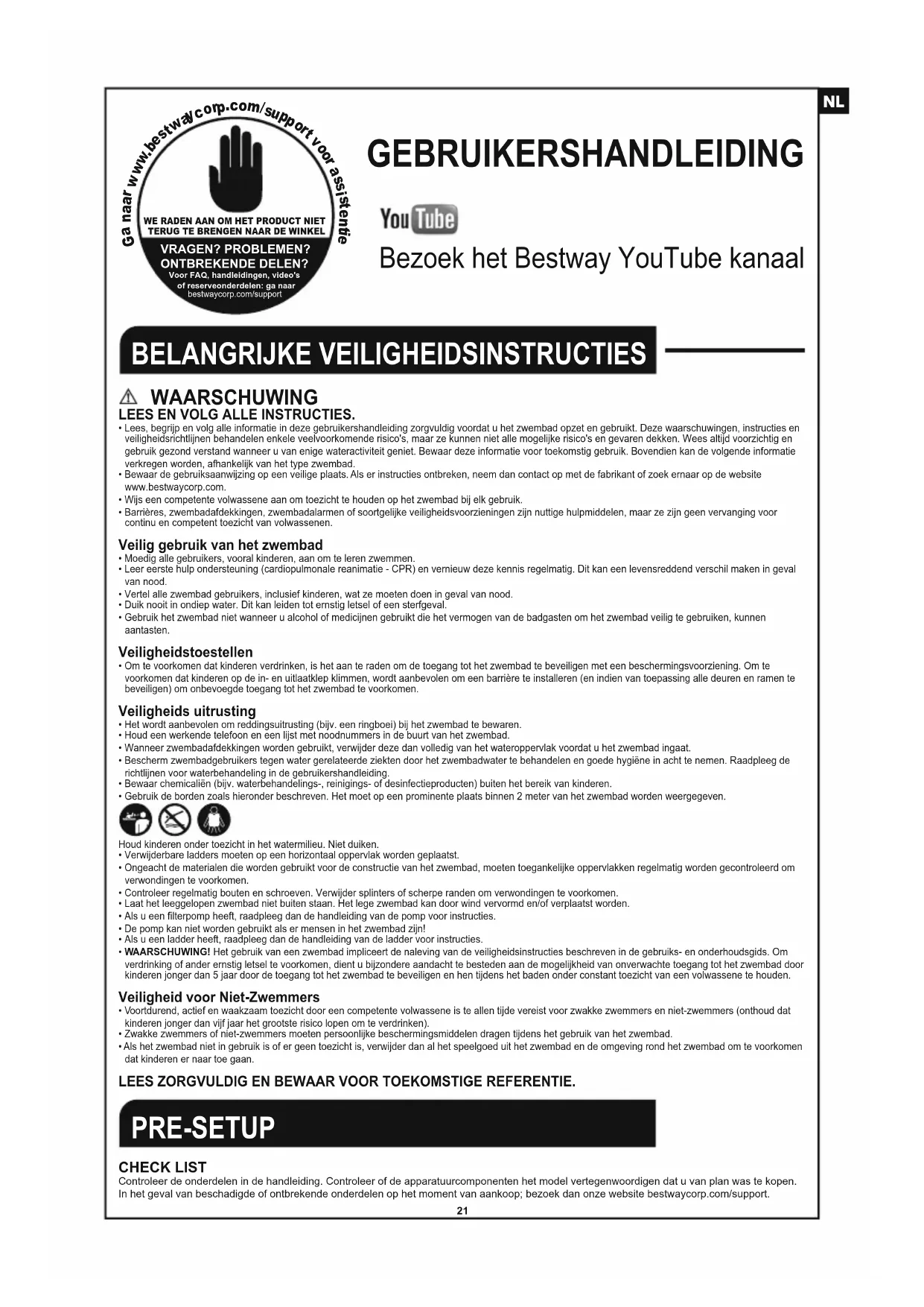 - Bewaar de gebruiksaanwijzing op een veilige plaats. Als er instructies ontbreken, neem dan contact op met de fabrikant of zoek ernaar op de website www.bestwaycorp.com.• Wijs een competente volwassene aan om toezicht te houden op het zwembad bij elk gebruik.