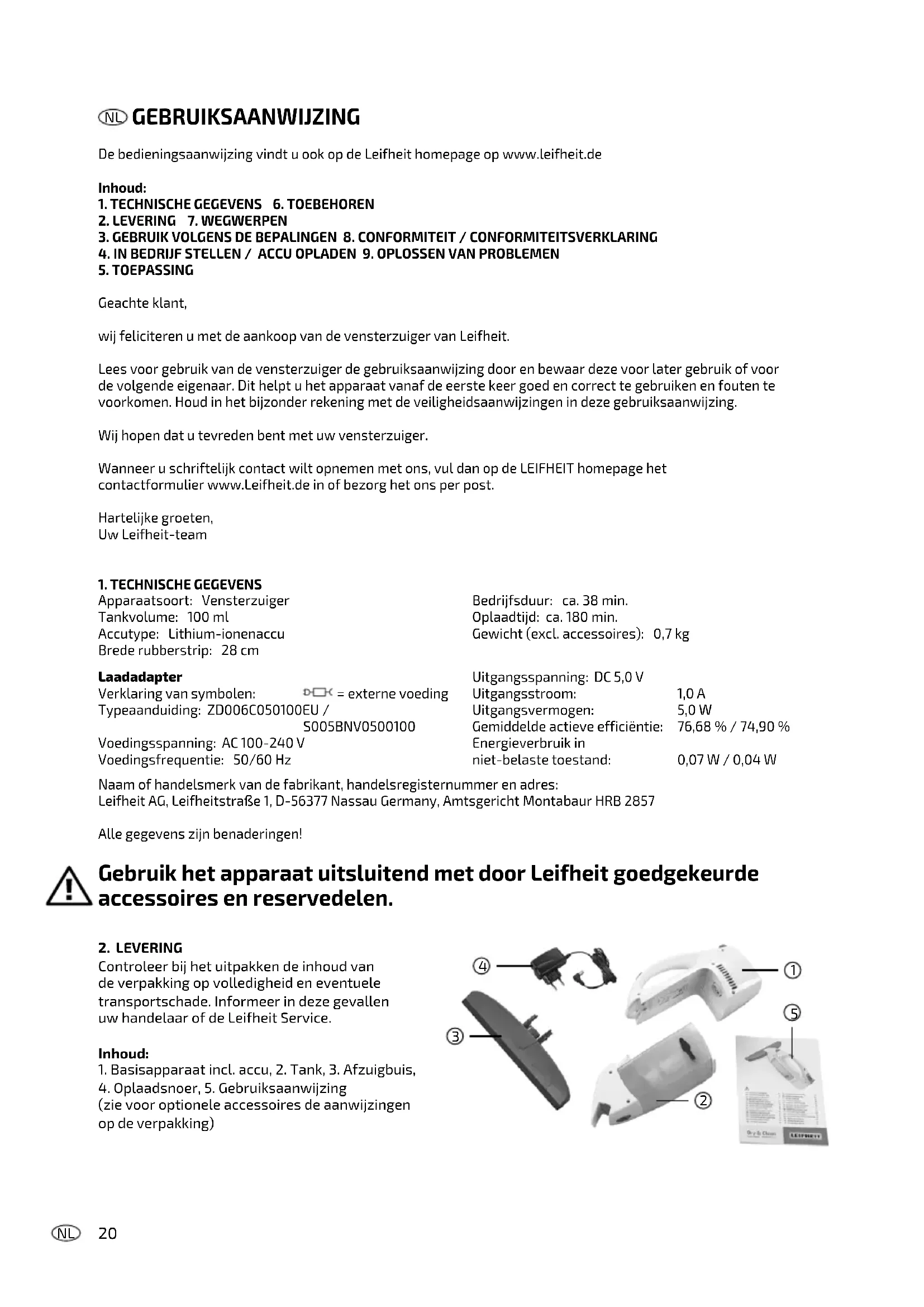 Apparaatsoort: Vensterzuiger Tankvolume: 100 ml Accutype: Lithium-ionenaccu Brede rubberstrip: 28 cm Bedrijfsduur: ca. 38 min. Oplaadtijd: ca. 180 min. Gewicht (excl. accessoires): 0,7 kg Naam of handelsmerk van de fabrikant, handelsregisternummer en adres: Leifheit AG, Leifheitstraße 1, D-56377 Nassau Germany, Amtsgericht Montabaur HRB 2857 Alle gegevens zijn benaderingen! Gebruik het apparaat uitsluitend met door Leifheit goedgekeurde accessoires en reservedelen. Laadadapter Verklaring van symbolen: = externe voeding Typeaanduiding: ZD006C050100EU / S005BNV0500100 Voedingsspanning: AC 100-240 V Voedingsfrequentie: 50/60 Hz Uitgangsspanning: DC 5,0 V Uitgangsstroom: 1,0 A Uitgangsvermogen: 5,0 W Gemiddelde actieve efficiëntie: 76,68 % / 74,90 % Energieverbruik in niet-belaste toestand: 0,07 W / 0,04 W21