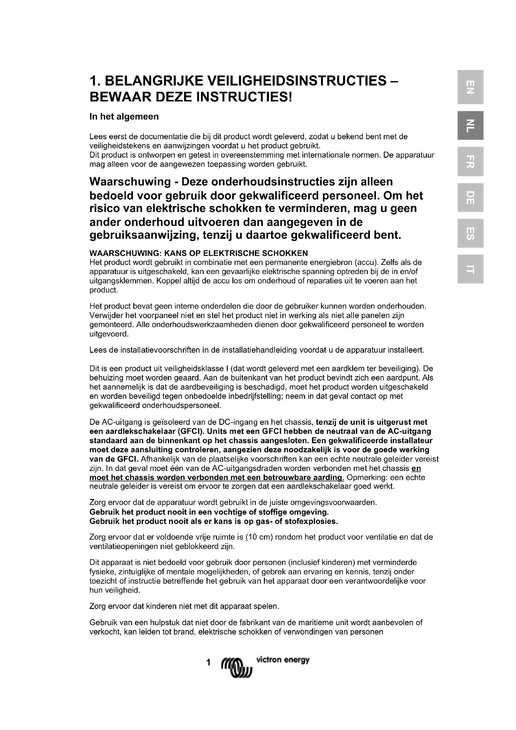 Het product wordt gebruikt in combinatie met een permanente energiebron (accu). Zelfs als de apparatuur is uitgeschakeld, kan een gevaarlijke elektrische spanning optreden bij de in en/of uitgangsklemmen. Koppel altijd de accu los om onderhoud of reparaties uit te voeren aan het product. Het product bevat geen interne onderdelen die door de gebruiker kunnen worden onderhouden. Verwijder het voorpaneel niet en stel het product niet in werking als niet alle panelen zijn gemonteerd. Alle onderhoudswerkzaamheden dienen door gekwalificeerd personeel te worden uitgevoerd. Lees de installatievoorschriften in de installatiehandleiding voordat u de apparatuur installeert. Dit is een product uit veiligheidsklasse I (dat wordt geleverd met een aardklem ter beveiliging). De behuizing moet worden geaard. Aan de buitenkant van het product bevindt zich een aardpunt. Als het aannemelijk is dat de aardbeveiliging is beschadigd, moet het product worden uitgeschakeld en worden beveiligd tegen onbedoelde inbedrijfstelling; neem in dat geval contact op met gekwalificeerd onderhoudspersoneel. De AC-uitgang is geïsoleerd van de DC-ingang en het chassis, tenzij de unit is uitgerust met een aardlekschakelaar (GFCI). Units met een GFCI hebben de neutraal van de AC-uitgang standaard aan de binnenkant op het chassis aangesloten. Een gekwalificeerde installateur moet deze aansluiting controleren, aangezien deze noodzakelijk is voor de goede werking van de GFCI. Afhankelijk van de plaatselijke voorschriften kan een echte neutrale geleider vereist zijn. In dat geval moet één van de AC-uitgangsdraden worden verbonden met het chassis en moet het chassis worden verbonden met een betrouwbare aarding. Opmerking: een echte neutrale geleider is vereist om ervoor te zorgen dat een aardlekschakelaar goed werkt. Zorg ervoor dat de apparatuur wordt gebruikt in de juiste omgevingsvoorwaarden. Gebruik het product nooit in een vochtige of stoffige omgeving. Gebruik het product nooit als er kans is op gas- of stofexplosies. Zorg ervoor dat er voldoende vrije ruimte is (10 cm) rondom het product voor ventilatie en dat de ventilatieopeningen niet geblokkeerd zijn. Dit apparaat is niet bedoeld voor gebruik door personen (inclusief kinderen) met verminderde fysieke, zintuiglijke of mentale mogelijkheden, of gebrek aan ervaring en kennis, tenzij onder toezicht of instructie betreffende het gebruik van het apparaat door een verantwoordelijke voor hun veiligheid. Zorg ervoor dat kinderen niet met dit apparaat spelen. Gebruik van een hulpstuk dat niet door de fabrikant van de maritieme unit wordt aanbevolen of verkocht, kan leiden tot brand, elektrische schokken of verwondingen van personen2