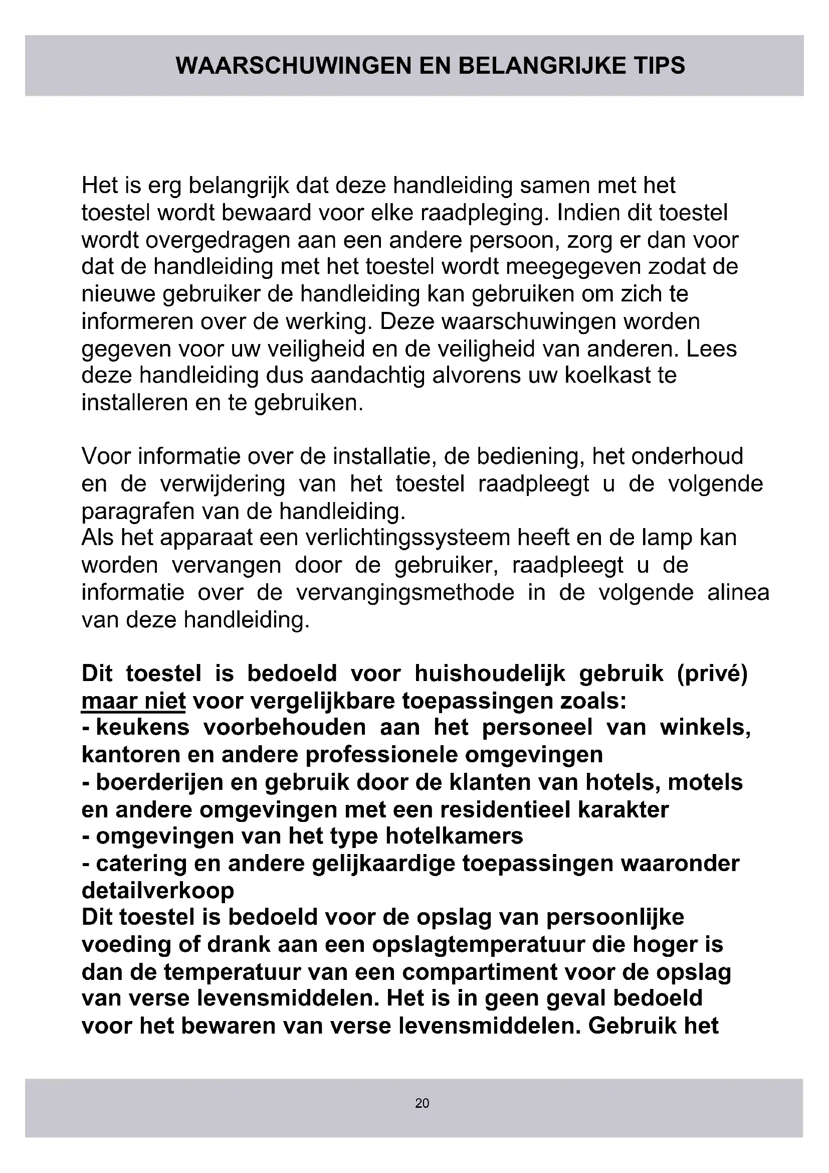 19Het is erg belangrijk dat deze handleiding samen met het toestel wordt bewaard voor elke raadpleging. Indien dit toestel wordt overgedragen aan een andere persoon, zorg er dan voor dat de handleiding met het toestel wordt meegegeven zodat de nieuwe gebruiker de handleiding kan gebruiken om zich te informeren over de werking. Deze waarschuwingen worden gegeven voor uw veiligheid en de veiligheid van anderen. Lees deze handleiding dus aandachtig alvorens uw koelkast te installeren en te gebruiken. Voor informatie over de installatie, de bediening, het onderhoud en de verwijdering van het toestel raadpleegt u de volgende paragrafen van de handleiding. Als het apparaat een verlichtingssysteem heeft en de lamp kan worden vervangen door de gebruiker, raadpleegt u de informatie over de vervangingsmethode in de volgende alinea van deze handleiding. Dit toestel is bedoeld voor huishoudelijk gebruik (privé) maar niet voor vergelijkbare toepassingen zoals: - keukens voorbehouden aan het personeel van winkels, kantoren en andere professionele omgevingen - boerderijen en gebruik door de klanten van hotels, motels en andere omgevingen met een residentieel karakter - omgevingen van het type hotelkamers - catering en andere gelijkaardige toepassingen waaronder detailverkoop Dit toestel is bedoeld voor de opslag van persoonlijke voeding of drank aan een opslagtemperatuur die hoger is dan de temperatuur van een compartiment voor de opslag van verse levensmiddelen. Het is in geen geval bedoeld voor het bewaren van verse levensmiddelen. Gebruik het