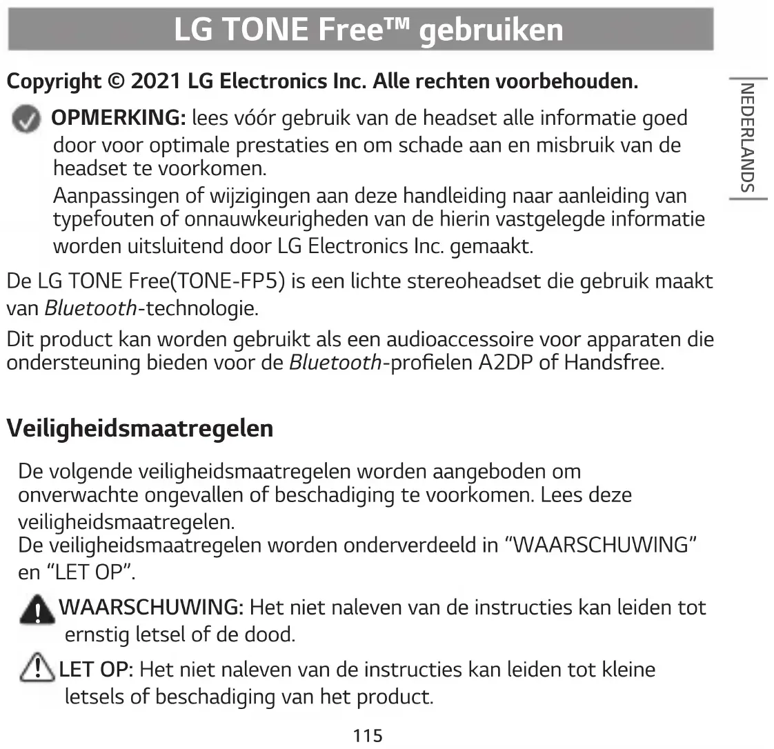 Copyright © 2021 LG Electronics Inc. Alle rechten voorbehouden. OPMERKING: lees vóór gebruik van de headset alle informatie goed door voor optimale prestaties en om schade aan en misbruik van de headset te voorkomen. Aanpassingen of wijzigingen aan deze handleiding naar aanleiding van typefouten of onnauwkeurigheden van de hierin vastgelegde informatie worden uitsluitend door LG Electronics Inc. gemaakt. De LG TONE Free(TONE-FP5) is een lichte stereoheadset die gebruik maakt van Bluetooth-technologie. Dit product kan worden gebruikt als een audioaccessoire voor apparaten die ondersteuning bieden voor de Bluetooth-proelen A2DP of Handsfree. Veiligheidsmaatregelen De volgende veiligheidsmaatregelen worden aangeboden om onverwachte ongevallen of beschadiging te voorkomen. Lees deze veiligheidsmaatregelen. De veiligheidsmaatregelen worden onderverdeeld in “WAARSCHUWING” en “LET OP”.