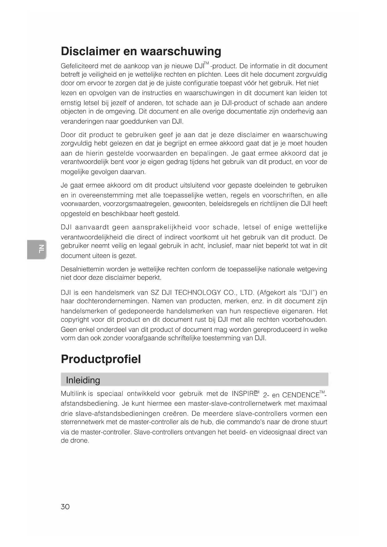 -product. De informatie in dit document betreft je veiligheid en je wettelijke rechten en plichten. Lees dit hele document zorgvuldig door om ervoor te zorgen dat je de juiste conguratie toepast vóór het gebruik. Het niet lezen en opvolgen van de instructies en waarschuwingen in dit document kan leiden tot ernstig letsel bij jezelf of anderen, tot schade aan je DJI-product of schade aan andere objecten in de omgeving. Dit document en alle overige documentatie zijn onderhevig aan veranderingen naar goeddunken van DJI. Door dit product te gebruiken geef je aan dat je deze disclaimer en waarschuwing zorgvuldig hebt gelezen en dat je begrijpt en ermee akkoord gaat dat je je moet houden aan de hierin gestelde voorwaarden en bepalingen. Je gaat ermee akkoord dat je verantwoordelijk bent voor je eigen gedrag tijdens het gebruik van dit product, en voor de mogelijke gevolgen daarvan. Je gaat ermee akkoord om dit product uitsluitend voor gepaste doeleinden te gebruiken en in overeenstemming met alle toepasselijke wetten, regels en voorschriften, en alle voorwaarden, voorzorgsmaatregelen, gewoonten, beleidsregels en richtlijnen die DJI heeft opgesteld en beschikbaar heeft gesteld. DJI aanvaardt geen aansprakelijkheid voor schade, letsel of enige wettelijke verantwoordelijkheid die direct of indirect voortkomt uit het gebruik van dit product. De gebruiker neemt veilig en legaal gebruik in acht, inclusief, maar niet beperkt tot wat in dit document uiteen is gezet. Desalniettemin worden je wettelijke rechten conform de toepasselijke nationale wetgeving niet door deze disclaimer beperkt. DJI is een handelsmerk van SZ DJI TECHNOLOGY CO., LTD. (Afgekort als “DJI”) en haar dochterondernemingen. Namen van producten, merken, enz. in dit document zijn handelsmerken of gedeponeerde handelsmerken van hun respectieve eigenaren. Het copyright voor dit product en dit document rust bij DJI met alle rechten voorbehouden. Geen enkel onderdeel van dit product of document mag worden gereproduceerd in welke vorm dan ook zonder voorafgaande schriftelijke toestemming van DJI. Productproel Inleiding Multilink is speciaal ontwikkeld voor gebruik met de INSPIRE