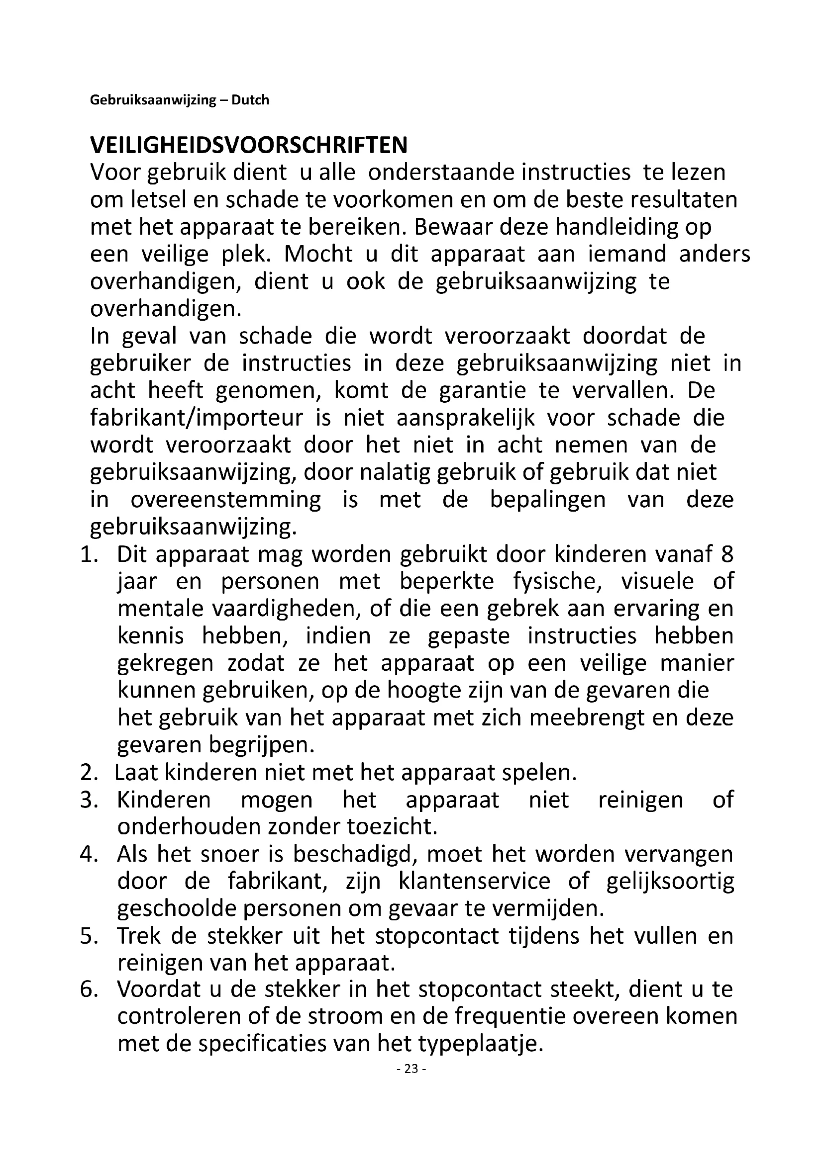 En ce qui concerne les informations pour les consommateurs sur comment installer, utiliser et entretenir le produit, les informations DEEE, consultez le manuel d’instruction fourni avec l’emballage.- 23 - Gebruiksaanwijzing – Dutch VEILIGHEIDSVOORSCHRIFTEN Voor gebruik dient u alle onderstaande instructies te lezen om letsel en schade te voorkomen en om de beste resultaten met het apparaat te bereiken. Bewaar deze handleiding op een veilige plek. Mocht u dit apparaat aan iemand anders overhandigen, dient u ook de gebruiksaanwijzing te overhandigen. In geval van schade die wordt veroorzaakt doordat de gebruiker de instructies in deze gebruiksaanwijzing niet in acht heeft genomen, komt de garantie te vervallen. De fabrikant/importeur is niet aansprakelijk voor schade die wordt veroorzaakt door het niet in acht nemen van de gebruiksaanwijzing, door nalatig gebruik of gebruik dat niet in overeenstemming is met de bepalingen van deze gebruiksaanwijzing.