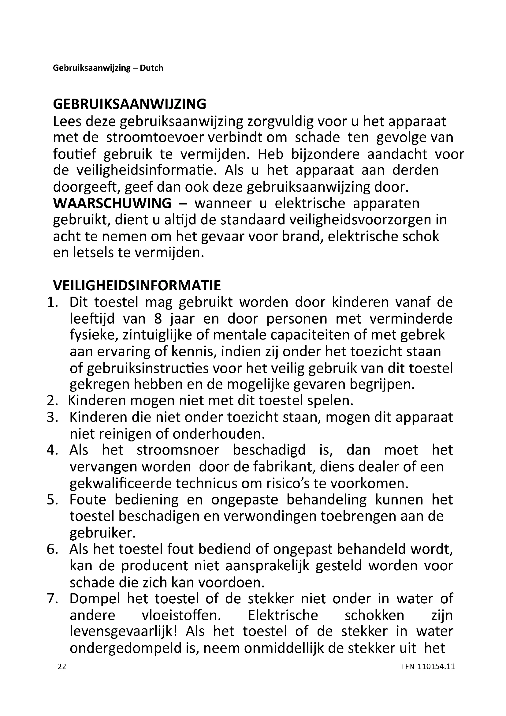 BATTERIET MÅSTE ÅTERVINNAS ELLER KASSERAS PÅ ETT KORREKT SÄTT. FÅR INTE Ö PPNAS. FÅR INTE KASSERAS I Ö PPEN ELD ELLER KORTSLUTAS.- 22 - TFN-110154.11 Gebruiksaanwijzing – Dutch GEBRUIKSAANWIJZING Lees deze gebruiksaanwijzing zorgvuldig voor u het apparaat met de stroomtoevoer verbindt om schade ten gevolge van foutief gebruik te vermijden. Heb bijzondere aandacht voor de veiligheidsinformatie. Als u het apparaat aan derden doorgeeft, geef dan ook deze gebruiksaanwijzing door. WAARSCHUWING – wanneer u elektrische apparaten gebruikt, dient u altijd de standaard veiligheidsvoorzorgen in acht te nemen om het gevaar voor brand, elektrische schok en letsels te vermijden. VEILIGHEIDSINFORMATIE