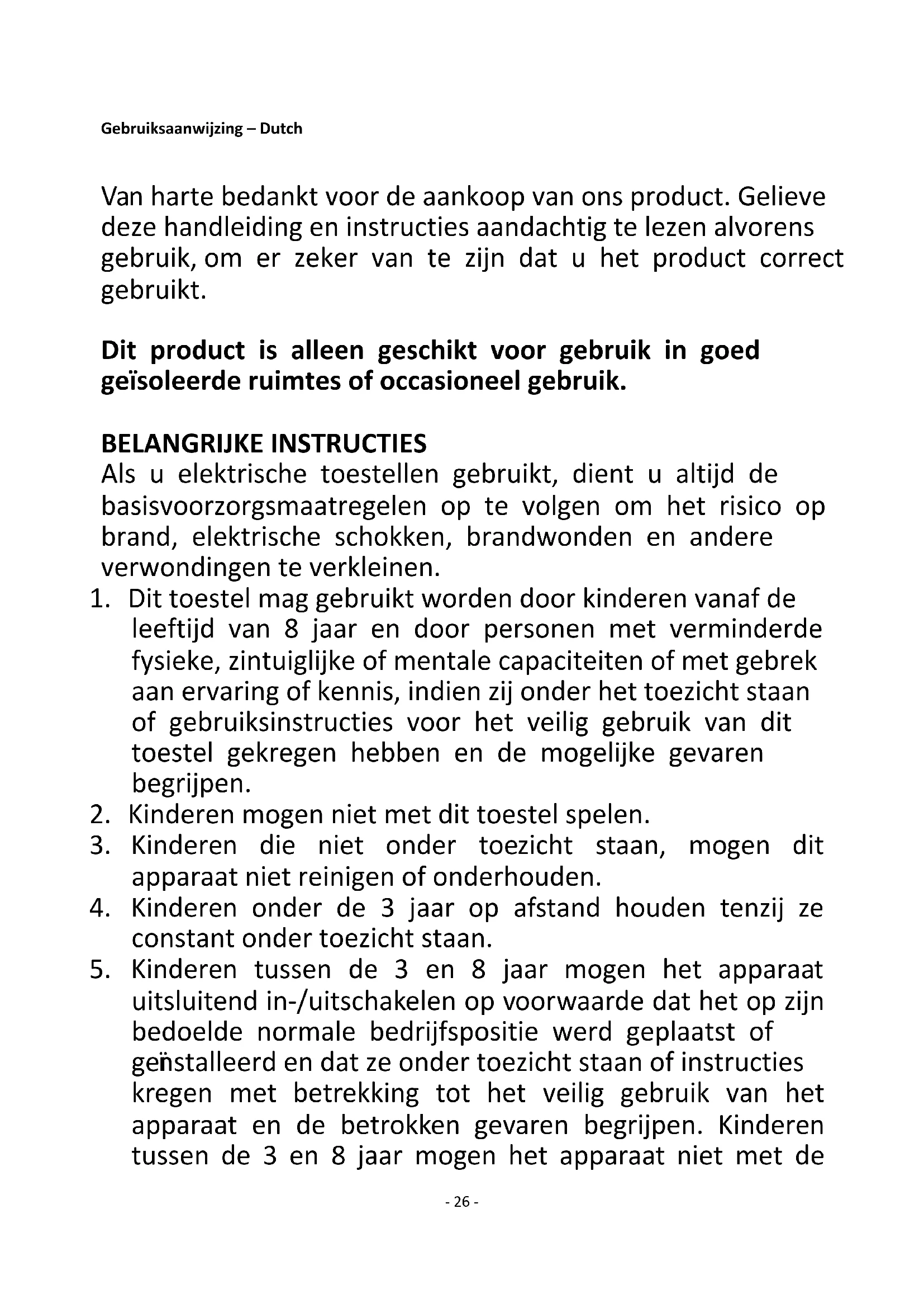 leeftijd van 8 jaar en door personen met verminderde fysieke, zintuiglijke of mentale capaciteiten of met gebrek aan ervaring of kennis, indien zij onder het toezicht staan of gebruiksinstructies voor het veilig gebruik van dit toestel gekregen hebben en de mogelijke gevaren begrijpen.