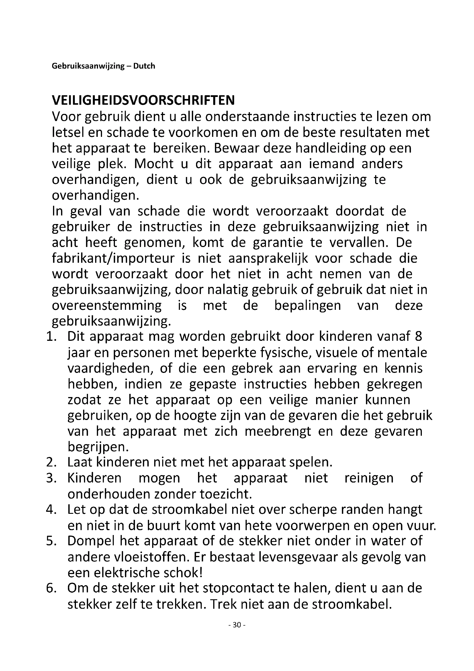 Återvinning - EU-direktiv 2012/19/EU Denna markering indikerar att produkten inte får kastas tillsammans med övrigt hushållsavfall. För att förhindra eventuell miljöförstöring och eventuella hälsorisker på grund av icke kontrollerad avyttring ska den avyttras med ansvar för att materialet ska kunna återanvändas på ett hållbart sätt. Returnera den använda enheten enligt retur- och insamlingssystem eller kontakta återförsäljaren som sålt produkten. Återförsäljaren kan ombesörja att produkten återvinns på ett miljömässigt säkert sätt. Emerio Deutschland GmbH (no service address) Lerchenweg 3 40789 Monheim am Rhein Deutschland Kundservice: T: +49 (0) 3222 1097 600 E: info.de@emerio.eu- 30 - Gebruiksaanwijzing – Dutch VEILIGHEIDSVOORSCHRIFTEN Voor gebruik dient u alle onderstaande instructies te lezen om letsel en schade te voorkomen en om de beste resultaten met het apparaat te bereiken. Bewaar deze handleiding op een veilige plek. Mocht u dit apparaat aan iemand anders overhandigen, dient u ook de gebruiksaanwijzing te overhandigen. In geval van schade die wordt veroorzaakt doordat de gebruiker de instructies in deze gebruiksaanwijzing niet in acht heeft genomen, komt de garantie te vervallen. De fabrikant/importeur is niet aansprakelijk voor schade die wordt veroorzaakt door het niet in acht nemen van de gebruiksaanwijzing, door nalatig gebruik of gebruik dat niet in overeenstemming is met de bepalingen van deze gebruiksaanwijzing.