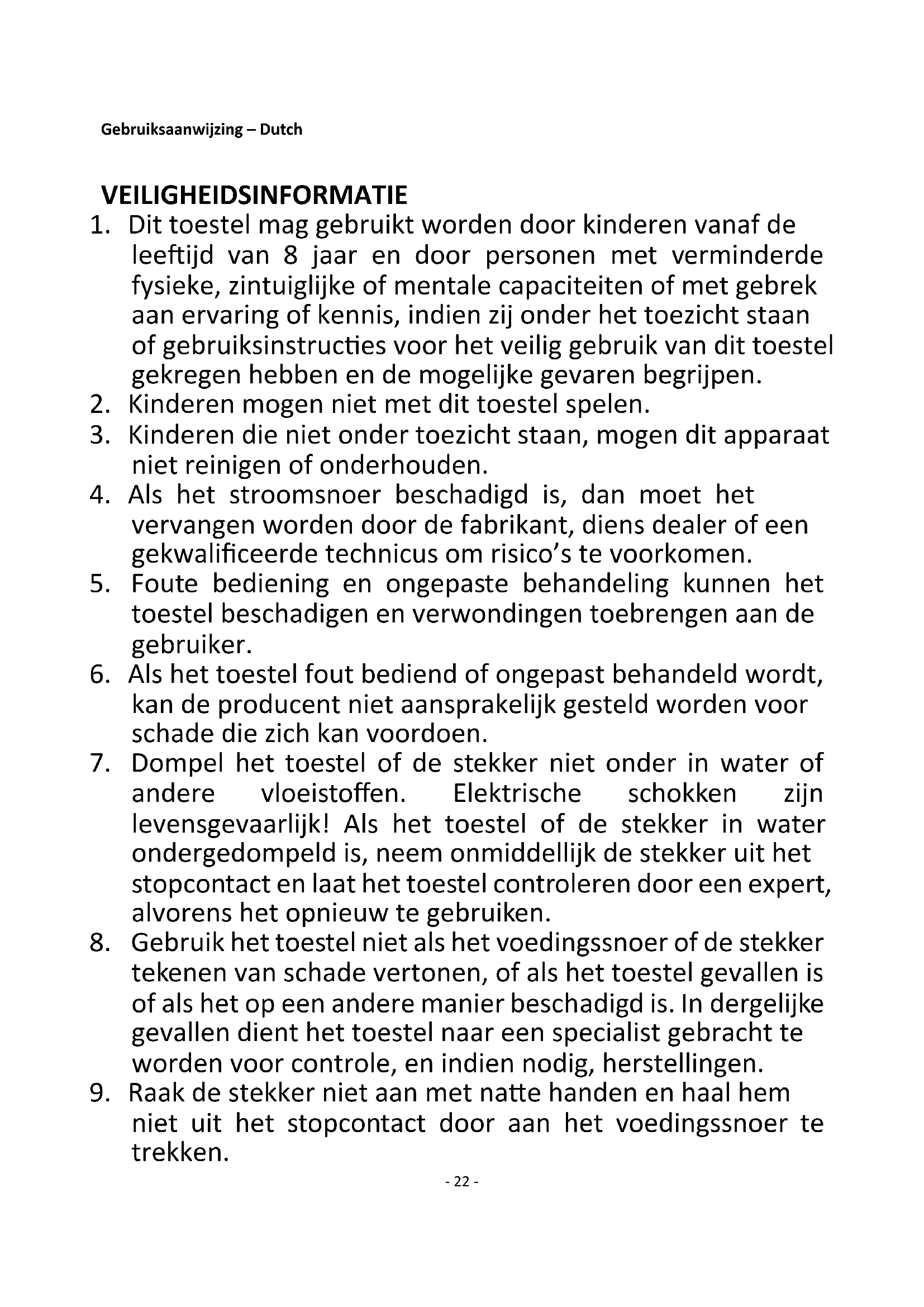 Gebruiksaanwijzing – Dutch VEILIGHEIDSINFORMATIE