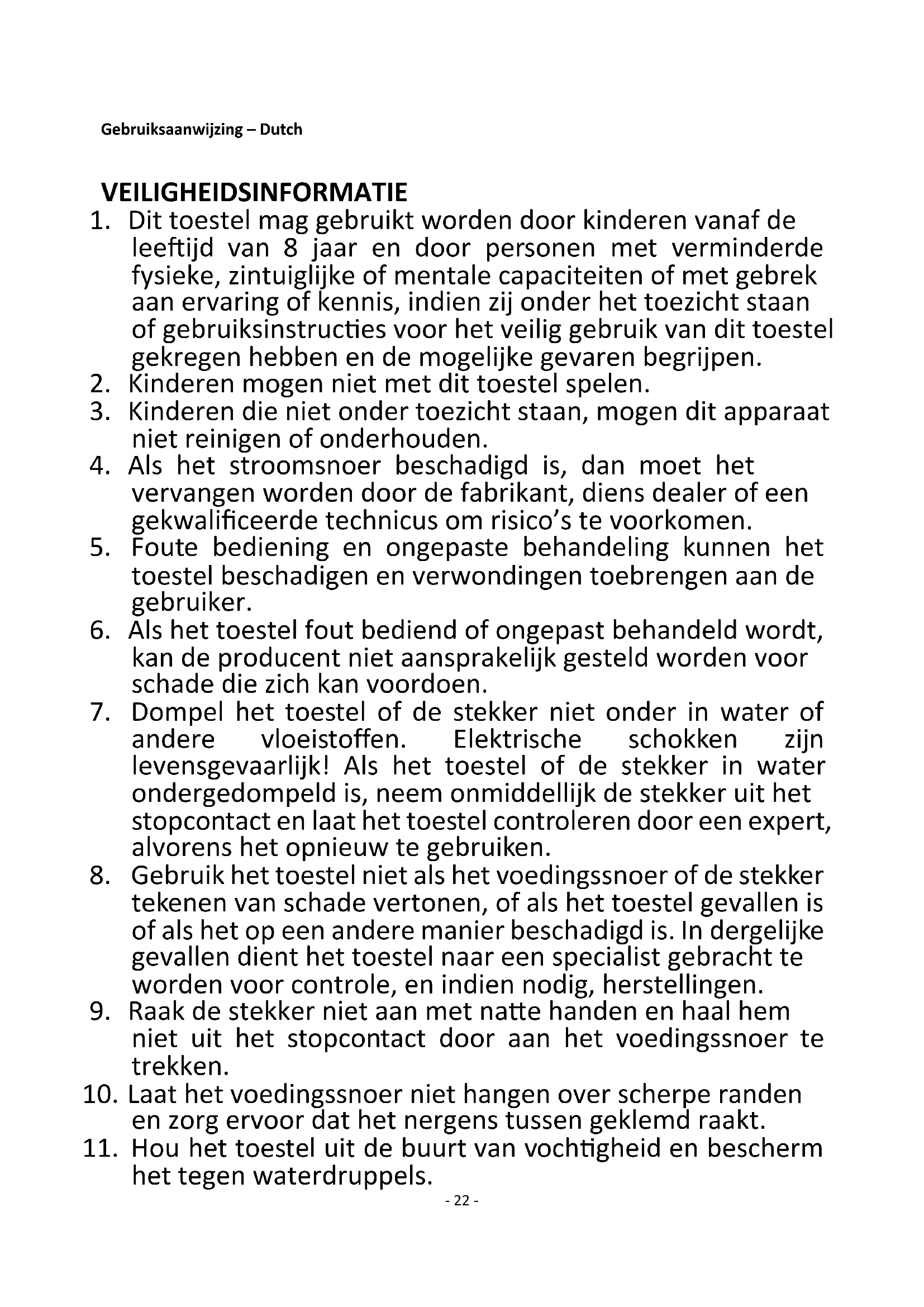 leeftijd van 8 jaar en door personen met verminderde fysieke, zintuiglijke of mentale capaciteiten of met gebrek aan ervaring of kennis, indien zij onder het toezicht staan of gebruiksinstructies voor het veilig gebruik van dit toestel gekregen hebben en de mogelijke gevaren begrijpen.