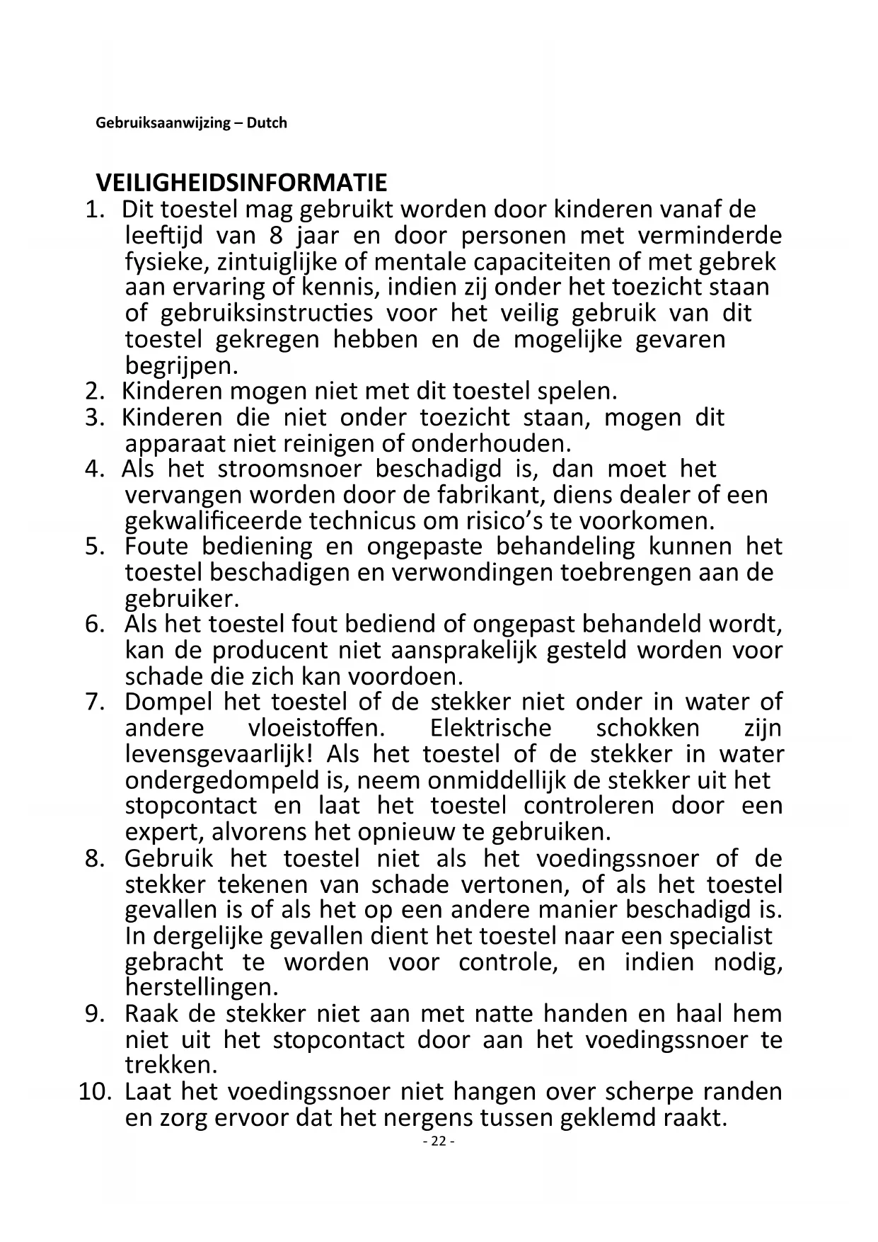 leeftijd van 8 jaar en door personen met verminderde fysieke, zintuiglijke of mentale capaciteiten of met gebrek aan ervaring of kennis, indien zij onder het toezicht staan of gebruiksinstructies voor het veilig gebruik van dit toestel gekregen hebben en de mogelijke gevaren begrijpen.