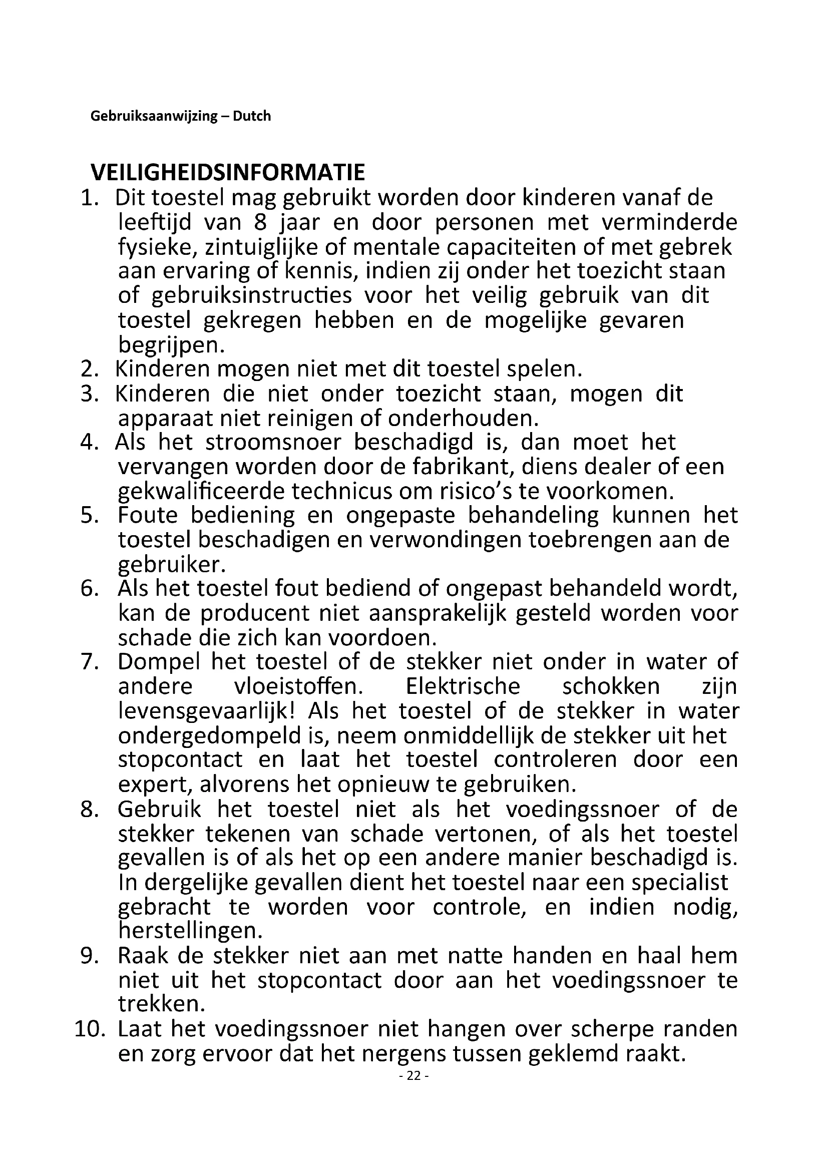 leeftijd van 8 jaar en door personen met verminderde fysieke, zintuiglijke of mentale capaciteiten of met gebrek aan ervaring of kennis, indien zij onder het toezicht staan of gebruiksinstructies voor het veilig gebruik van dit toestel gekregen hebben en de mogelijke gevaren begrijpen.