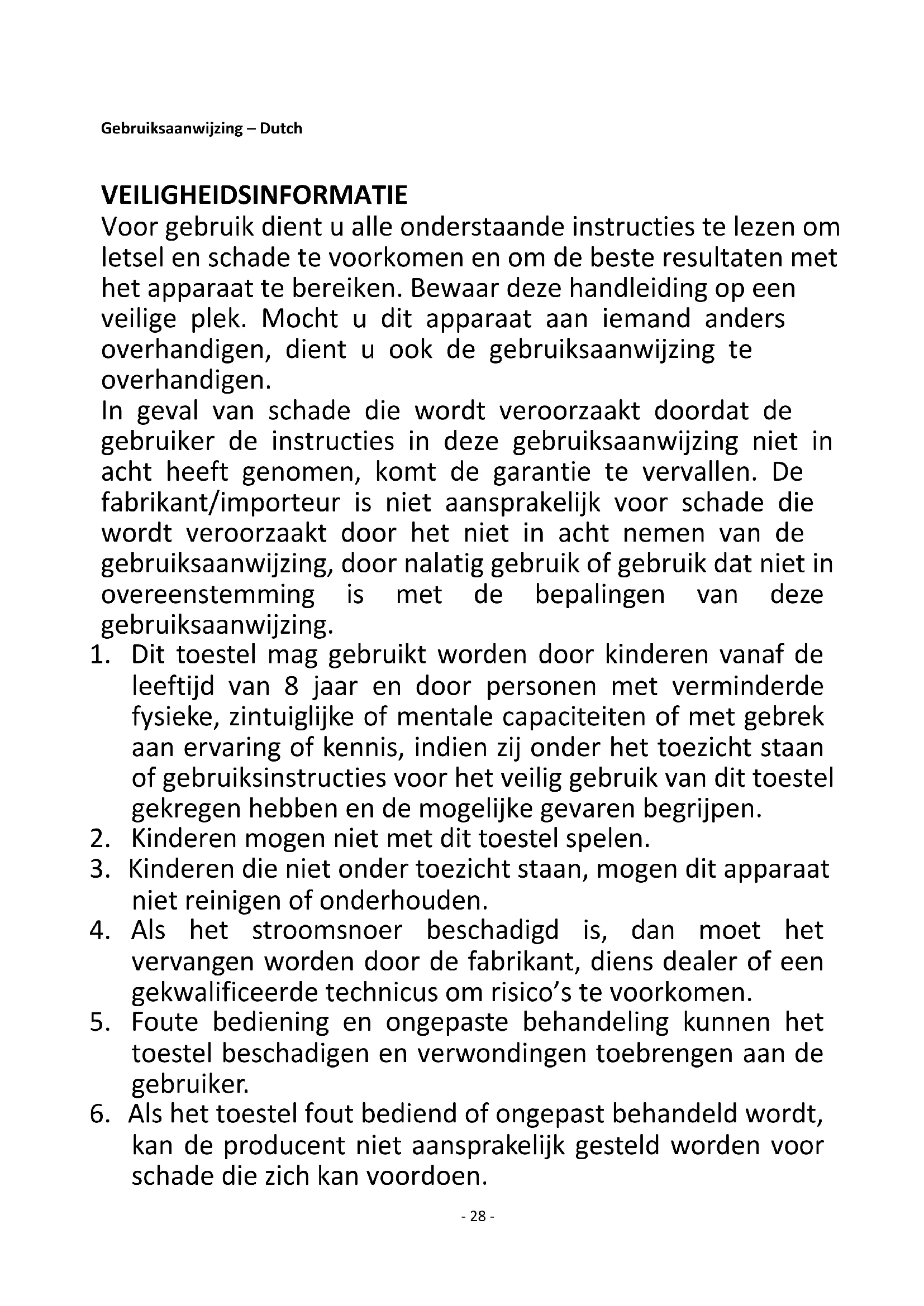 6. Als het toestel fout bediend of ongepast behandeld wordt,