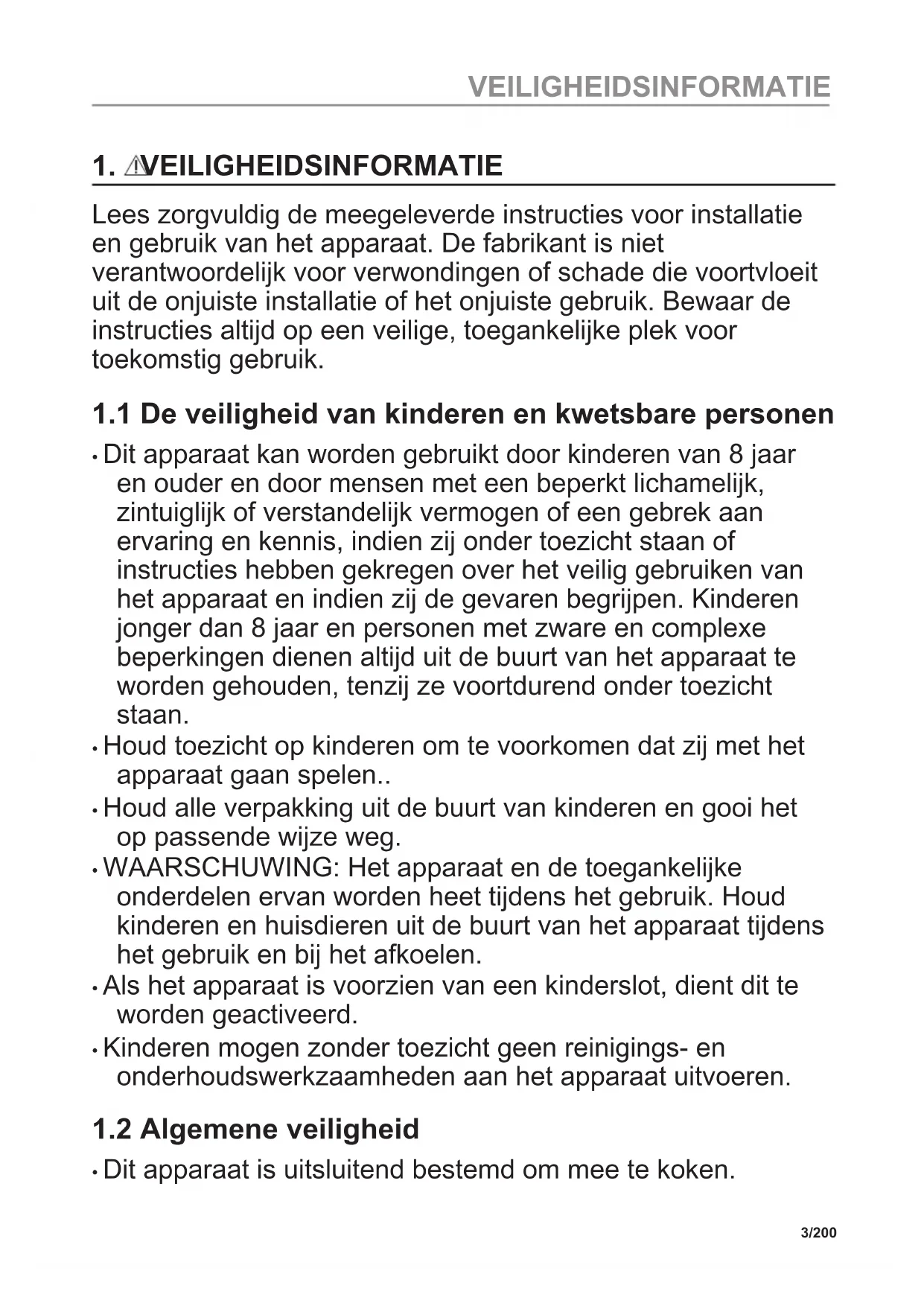 - Dit apparaat is uitsluitend bestemd om mee te koken. 3/200 VEILIGHEIDSINFORMATIE• Dit apparaat is bedoeld voor binnenshuis huishoudelijk gebruik.
