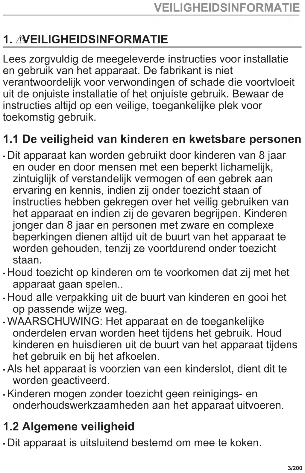 - Dit apparaat is uitsluitend bestemd om mee te koken. 3/200 VEILIGHEIDSINFORMATIE• Dit apparaat is bedoeld voor binnenshuis huishoudelijk gebruik.