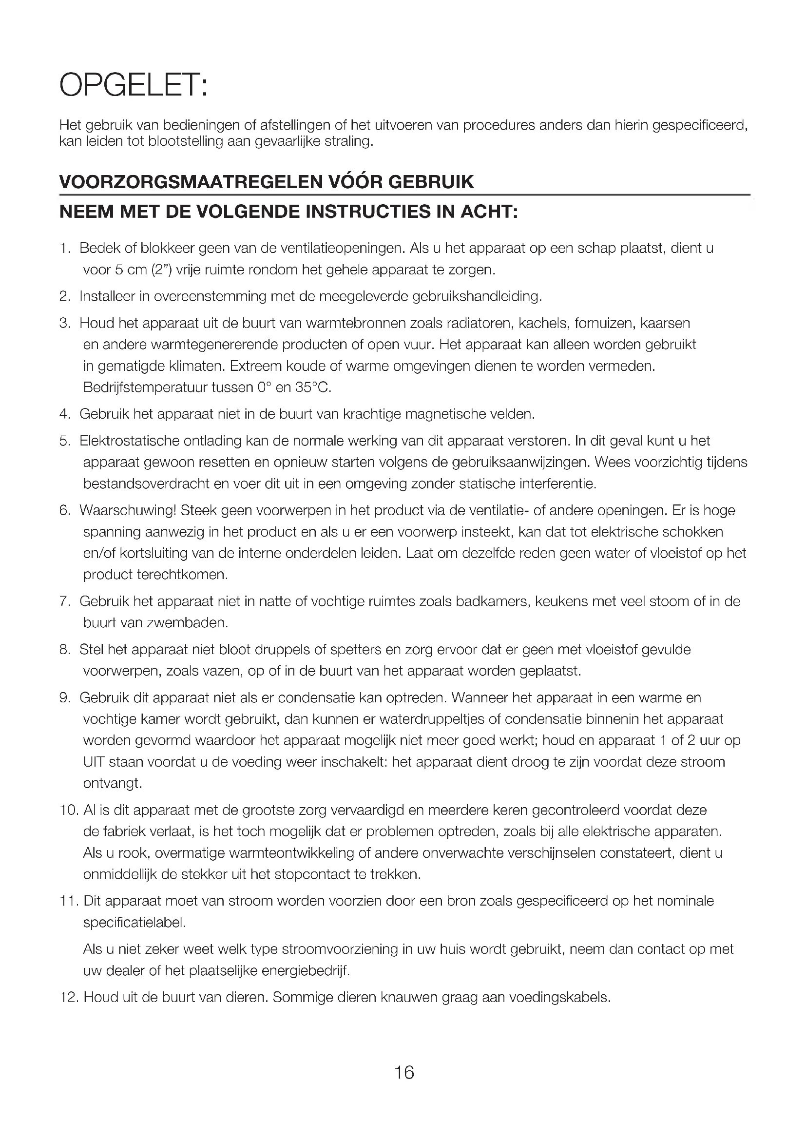 vochtige kamer wordt gebruikt, dan kunnen er waterdruppeltjes of condensatie binnenin het apparaat worden gevormd waardoor het apparaat mogelijk niet meer goed werkt; houd en apparaat 1 of 2 uur op UIT staan voordat u de voeding weer inschakelt: het apparaat dient droog te zijn voordat deze stroom ontvangt.