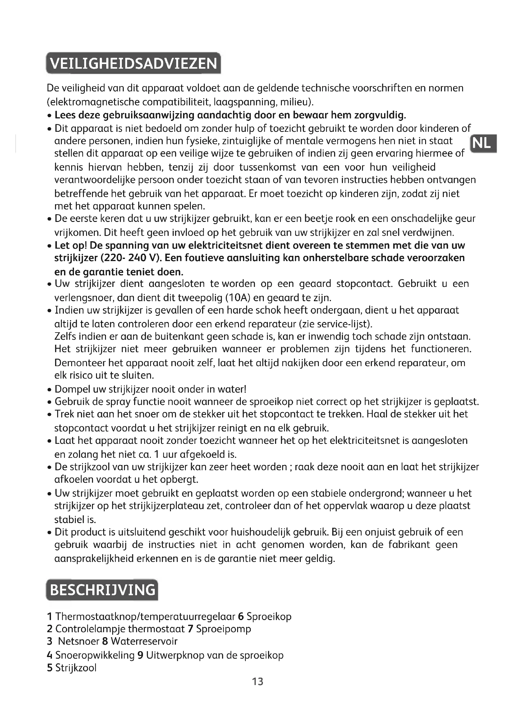 - Dit product is uitsluitend geschikt voor huishoudelijk gebruik. Bij een onjuist gebruik of een gebruik waarbij de instructies niet in acht genomen worden, kan de fabrikant geen aansprakelijkheid erkennen en is de garantie niet meer geldig. BESCHRIJVING 1 Thermostaatknop/temperatuurregelaar 6 Sproeikop 2 Controlelampje thermostaat 7 Sproeipomp 3 Netsnoer 8 Waterreservoir 4 Snoeropwikkeling 9 Uitwerpknop van de sproeikop 5 Strijkzool 9100013389 FS45XX_110x154 23/05/13 12:33 Page1314 WELKE SOORT WATER GEBRUIKEN? Het apparaat is ontworpen om te functioneren met onbehandeld leidingwater. WELKE SOORTEN WATER NIET GEBRUIKEN? Onderstaande soorten water bevatten minerale elementen die vroegtijdige slijtage van het apparaat kunnen veroorzaken: vul uw Tefal strijkijzer niet met geparfumeerd of onthard water of water met additieven. GEBRUIK Stel de temperatuur