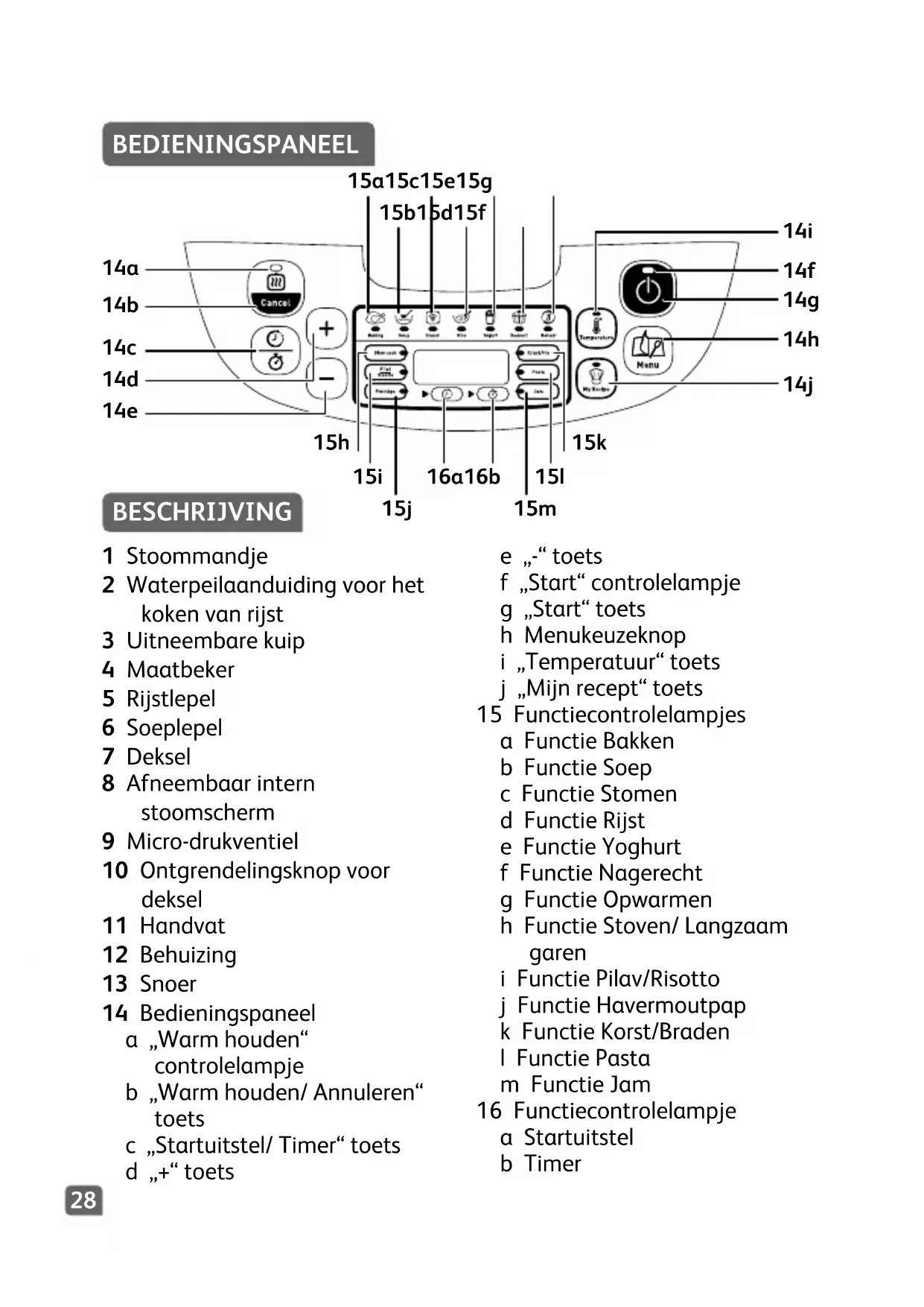 Température élevée détectée. Remarque: Si le bol de cuisson interne est déformé, arrêtez de l'utiliser et demandez un bol de rechange auprès d’un centre de réparation agréé.28 BEDIENINGSPANEEL BESCHRIJVING 1 Stoommandje 2 Waterpeilaanduiding voor het koken van rijst 3 Uitneembare kuip 4 Maatbeker 5 Rijstlepel 6 Soeplepel 7 Deksel 8 Afneembaar intern stoomscherm 9 Micro-drukventiel 10 Ontgrendelingsknop voor deksel 11 Handvat 12 Behuizing 13 Snoer 14 Bedieningspaneel a „Warm houden“ controlelampje b „Warm houden/ Annuleren“ toets c „Startuitstel/ Timer“ toets d „+“ toets e „-“ toets f „Start“ controlelampje g „Start“ toets h Menukeuzeknop i „Temperatuur“ toets j „Mijn recept“ toets 15 Functiecontrolelampjes a Functie Bakken b Functie Soep c Functie Stomen d Functie Rijst e Functie Yoghurt f Functie Nagerecht g Functie Opwarmen h Functie Stoven/ Langzaam garen i Functie Pilav/Risotto j Functie Havermoutpap k Functie Korst/Braden l Functie Pasta m Functie Jam 16 Functiecontrolelampje a Startuitstel b Timer 14f 14g 14h 14j 14i 15h 15i 16a 16b 15j 15k 15l 15m 14a 14b 14c 14d 14e 15b 15d 15f 15a 15c 15e 15g29