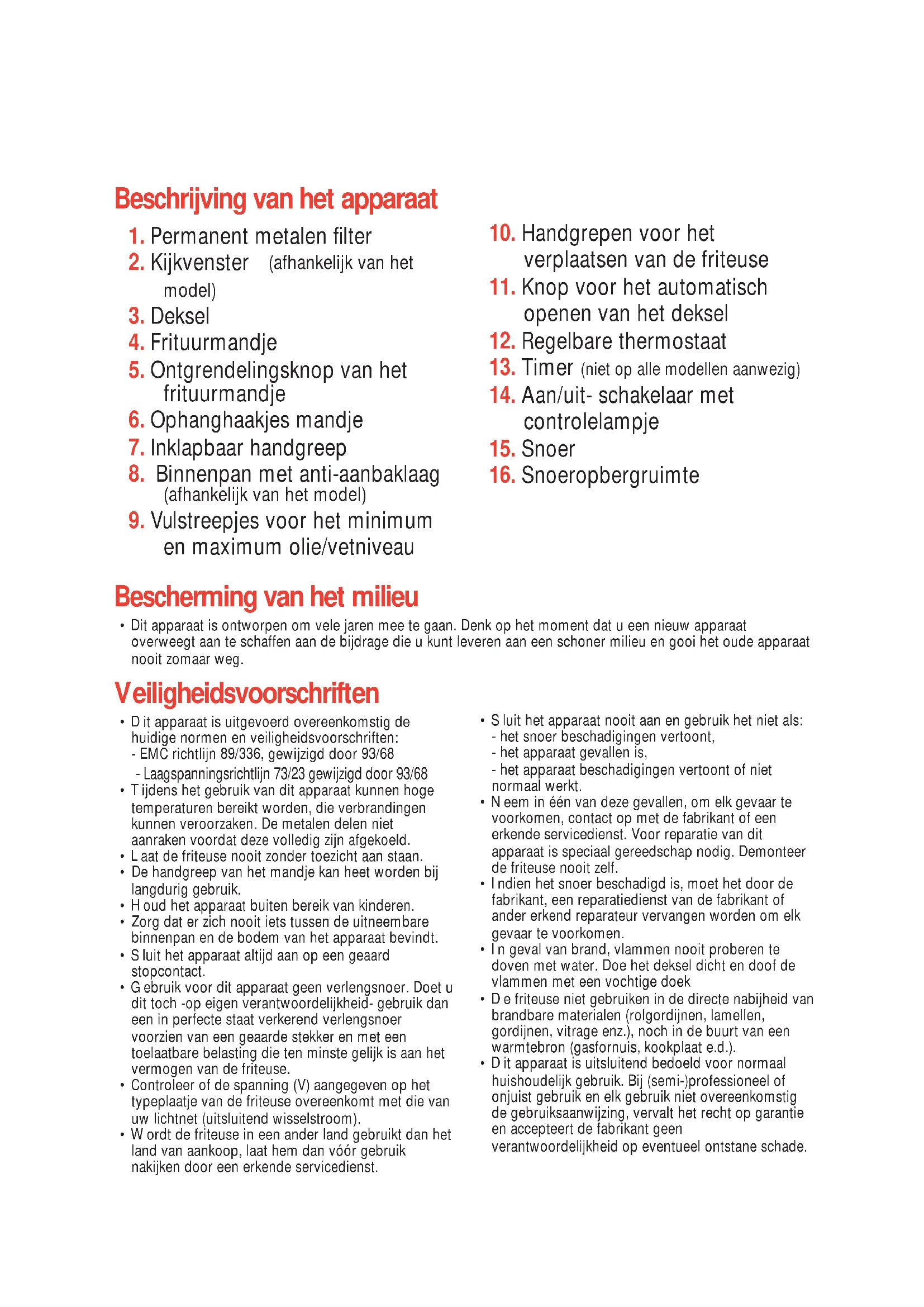 - Dit apparaat is ontworpen om vele jaren mee te gaan. Denk op het moment dat u een nieuw apparaat overweegt aan te schaffen aan de bijdrage die u kunt leveren aan een schoner milieu en gooi het oude apparaatnooit zomaar weg. Veiligheidsvoorschriften